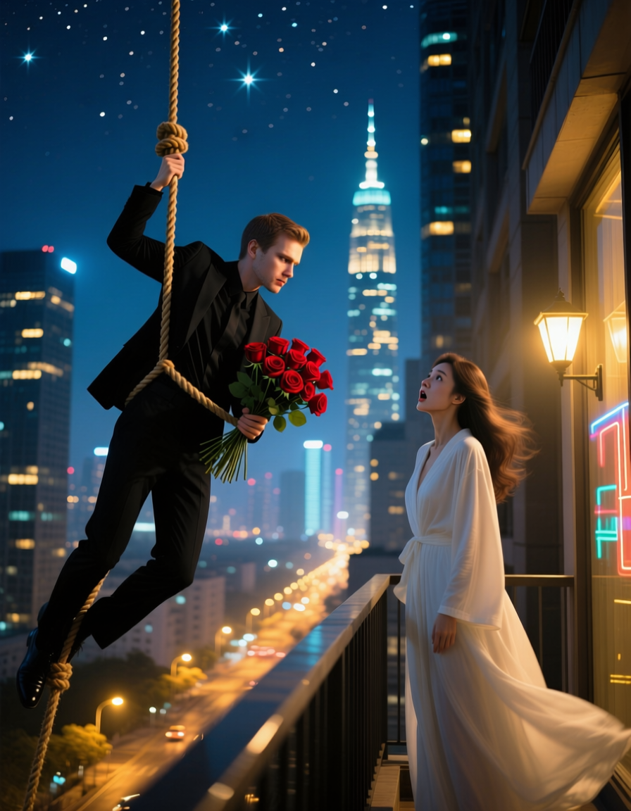 – А-а-а-а! – сорвалось с моих губ, а тело отскочило назад, ударилось о спинку кресла, едва не упав. Но оно стоило того: прямо за стеклом, в метре от меня, на каких-то верёвках, словно альпинист, висел Роман Орловский! И не просто висел – сиял своей наглой улыбкой, держа в руках букет алых цветов. Красные лепестки казались чёрными в тусклом свете уличного фонаря, а он, подвешенный, выглядел безумцем, беглецом из какого-то фантастического романтического фильма.