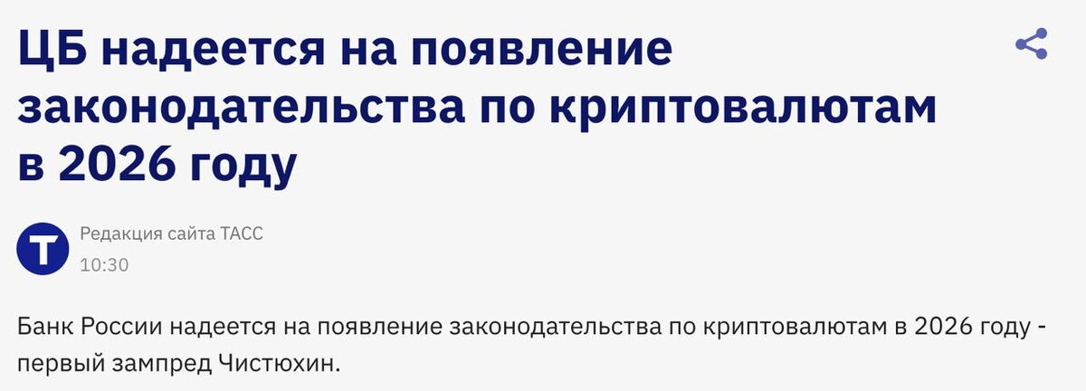 🇷🇺 ЦБ РФ надеется на появление законодательства по криптовалютам в 2026 году (ТАСС)