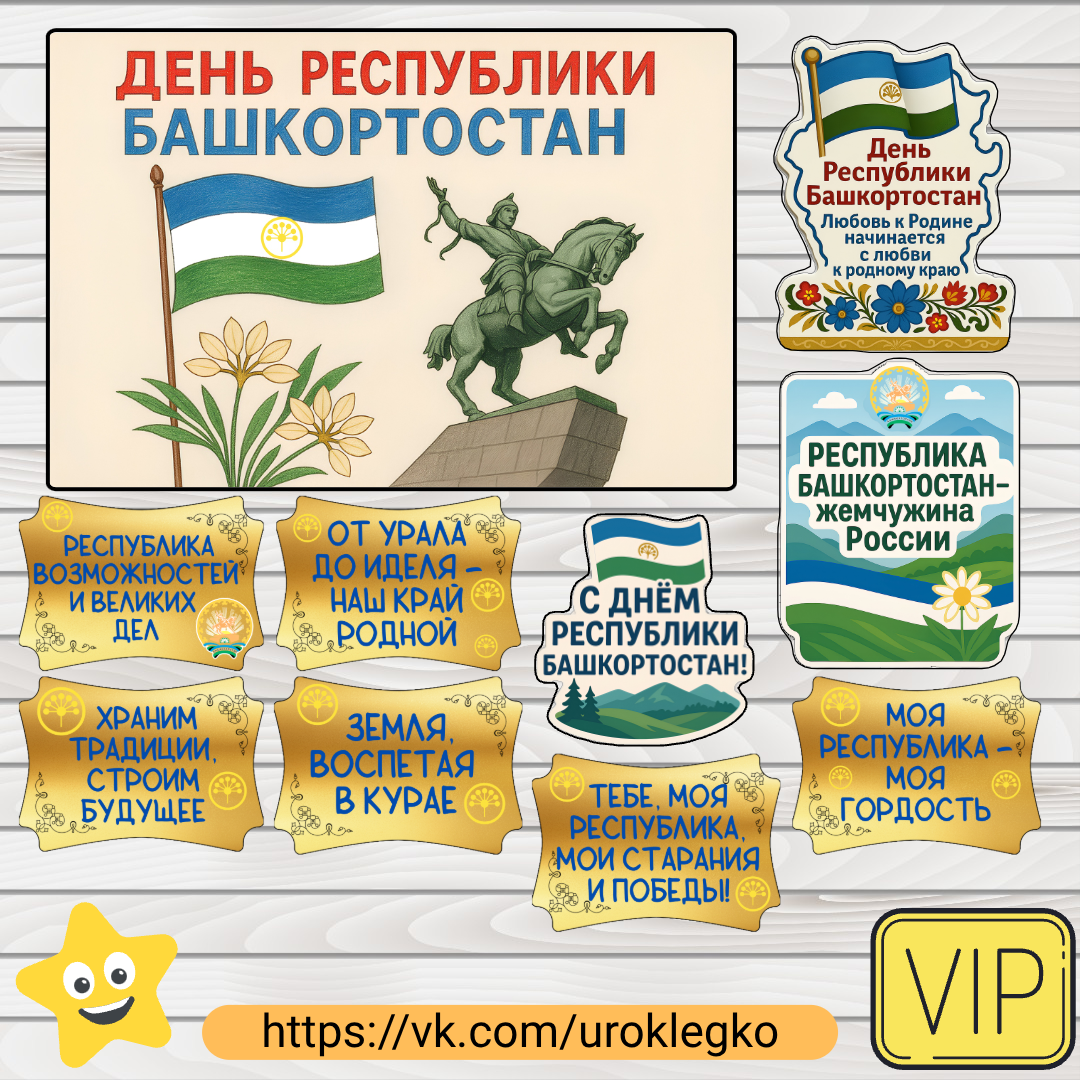 Оформление школы ко Дню республики Башкортостан необходимо для создания торжественной и патриотической атмосферы, которая визуально погружает учащихся в значимость праздника, наглядно знакомит их с государственной символикой и ключевыми ценностями родного края, а также способствует воспитанию чувства гордости и уважения к его истории и культуре. Яркий плакат станет смысловым центром композиции в холле или классе, а набор тематических фраз на листах А4 позволит гибко и информативно оформить другие зоны — стенды, коридоры или кабинеты, сделав праздник зримым и понятным для всей школьной аудитории. Где можно скачать: https://vk.com/uroklegko
