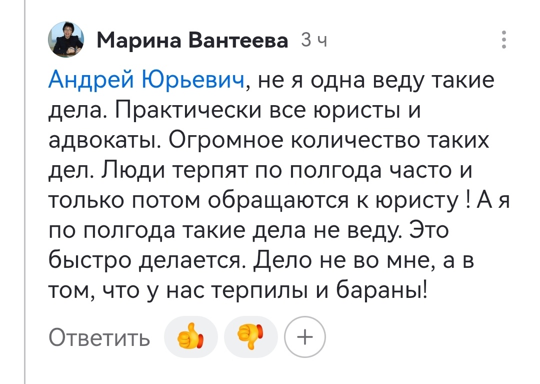Здесь не будет моих любимых картинок сформированных ИИ, хотя я нашел очень крутой инструмент, с которым вы будете в шоке. Кстати если кому-то нужны интересные ваши фотографии пишите в комментариях. За символическую сумму сделаю Вам чудо. Если под этим постом наберётся достаточно комментариев, покажу вам примеры работ. А теперь смотрите, как женщина показала яркий пример, каким может быть абсолютно конченный человек, который кроме себя самого никого не уважает. Для справки это юрист из Чувашии, что уже само по себе диагноз. Почитали комментарии? Данная дама принимает высокомерие, считает, что она богиня и ее мнение это истина в последней инстанции. А если кто не согласен, то она затыкает им рот. Заметьте, что даже наше государство имеющее полное законное право на применения насилия этого не делает. Еще данная дама говорит о безграмотности моей речи. Что потрясает своим невежеством и незнанием законов. Я вот к ней в школу учится пришёл. А в реале такой прием использует, когда по сут