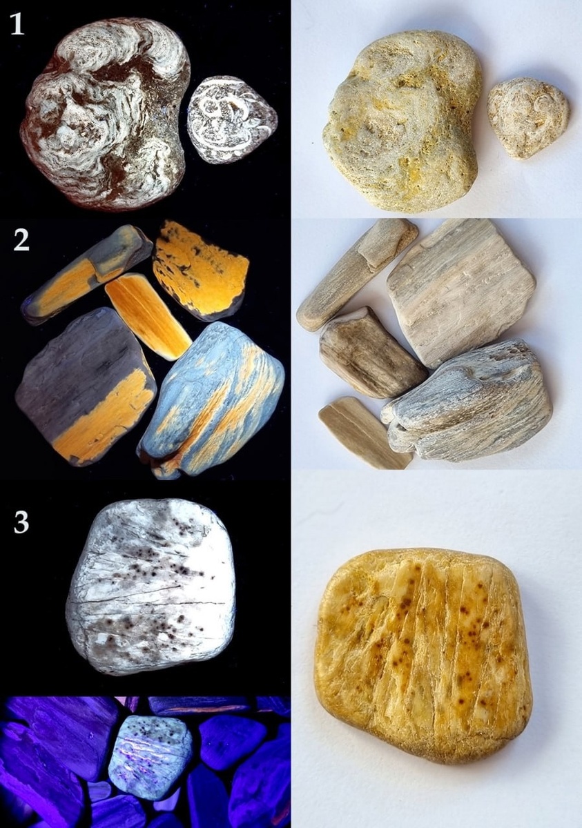 «№1 – некая окаменелость и ракушечник, №2 – окаменелая древесина, №3 окаменелая кость или древесина, №4 – затрудняюсь опознать, камень или окаменелость, № 5 – современная ракушка. Все образцы в свете ультрафиолетового фонарика с длинной волны 365 нм. светятся разными цветами, при этом свечение наблюдается только у части органических образов. Можно ли узнать подробнее про эти конкретные примеры?» — спрашивает наша подписчица Елена Петреева. Отвечает геолог Кирилл Юшин: