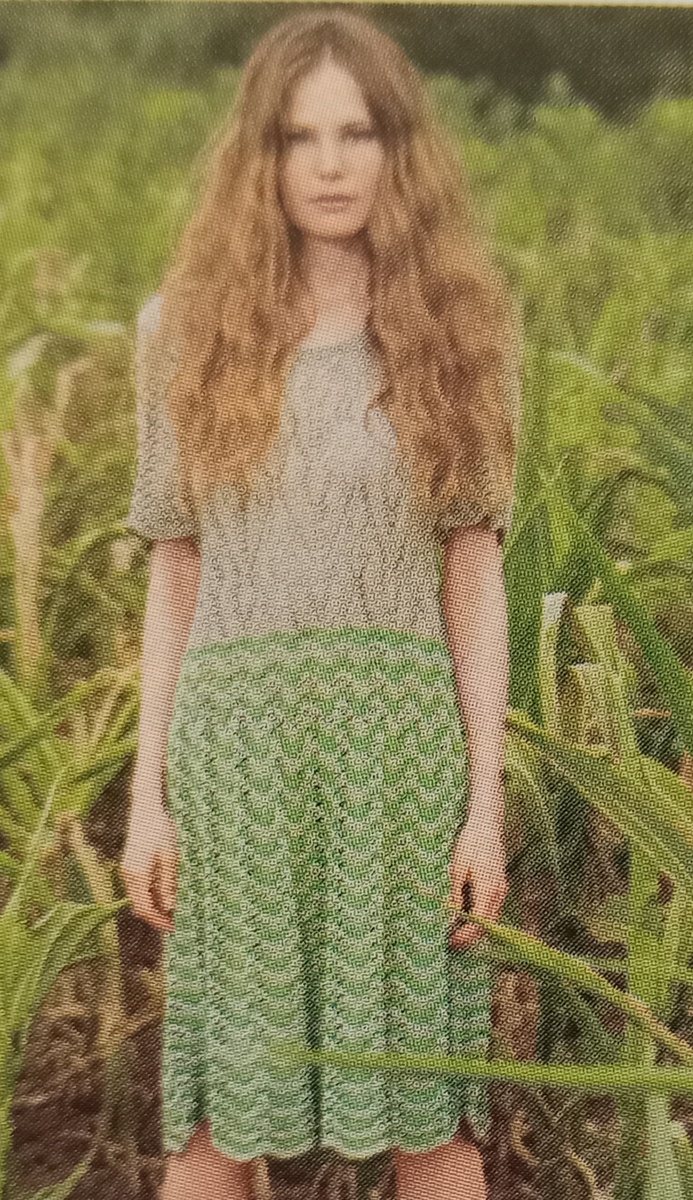 Платье с волнистым и ажурными узорами. Очень женственное платье с ажурным однотонным лифом, заниженной линией талии и двухцветной волнистой юбкой из пряжи природных оттенков подчеркнет вашу естественную красоту. 40/42 (48/50). Отличающиеся данные для размера 48/50 приведены в скобках. Все узоры вязать спицами №4. Платочная вязка: лиц. и изн. р. - лиц. п. В круг. р. вязать попеременно 1 круг. р. лиц. п., 1 круг. р. изн. п. Лицевая гладь: лиц. р. - лиц. п., изн. р. - изн. п. Волнистый узор А: число петель кратно 17 + 2 кром. Вязать по схеме 1. На схеме приведены только лиц. р. В изн. р. петли и накиды вязать изн. Между кром. повторять петли раппорта и с 1-го по 4-й р. Волнистый узор В: число петель кратно 11 + 2 кром. Вязать как волнистый узор А, но по схеме 2. Ажурный узор: число петель кратно 22 + 15 + 2 кром. Вязать по схеме 3. На схеме приведены только лиц. р. В изн. р. петли и накиды вязать изн. Начинать с 1 кром. и петель до раппорта, затем повторять петли раппорта, заканчивать пет