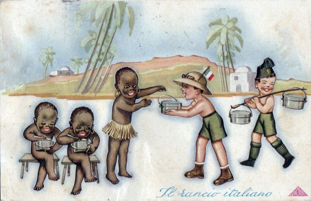 Любопытно, что сами итальянцы рассматривали – или, по крайней мере, изображали – эту войну как своего рода благодеяние для населения Эфиопии (её называли также Абиссинией). На заглавной открытке итальянские военные, изображённые в виде детей (тогда, ещё со времён Первой мировой, это был популярный жанр – изображать военных на открытках в виде невинных детишек), кормят полуголых африканок настоящей итальянской едой. Те наворачивают её за обе щеки и счастливы!..