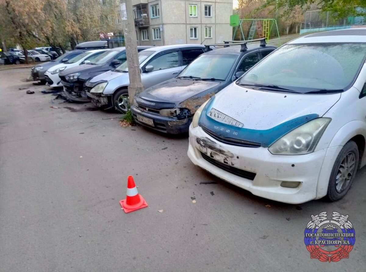 В красноярском микрорайоне Черёмушки пьяный водитель уснул за рулём и протаранил семь припаркованных автомобилей. Инцидент произошёл утром 9 октября во дворе на Шевченко, 28. Полицейским 22-водитель рассказал, что ехал домой после распития алкоголя. Показания алкотестера составили 0,69 мг/л — в четыре раза выше допустимой нормы. В отношении водителя составили протокол за вождение в нетрезвом виде. Ему грозит штраф в 45 тысяч и лишение прав на срок до двух лет. Кроме того, нарушителя оштрафовали за отсутствие ОСАГО. Машину поместили на штрафстоянку. — Если вы заметили на дороге водителя, предположительно находящегося в состоянии опьянения, убедительно просим сообщить об этом по телефону «Синей линии» в Красноярске 263-10-19 или через чат-бот @Alkoline_Krsk_bot. Ваши действия могут помочь предотвратить трагедию и сохранить чью-то жизнь. Госавтоинспекция. фото: t.me/gibdd124