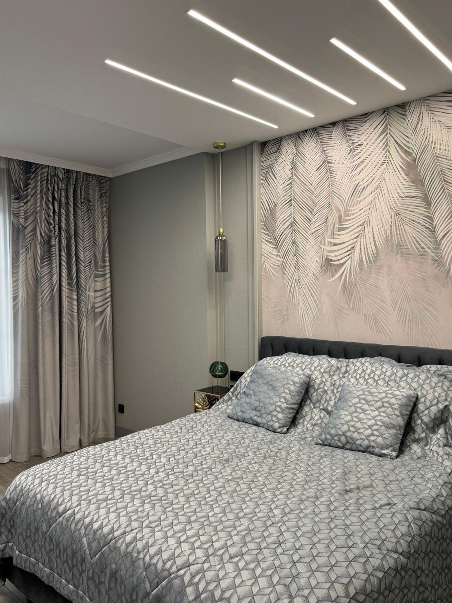 Фабрика Affresco даёт возможность повторить мотив сюжетных обоев и на шторах 🌴 Печать на ткани - новое слово в текстильном декорировании. Печать сделана на ткани Microvelur. Это низковорсный бархат без пальчикового эффекта. Для идеальной защиты от света шторы сшиты на подкладке димаут. Лёгкий июль с вертикальной выработкой прекрасно сочетается со шторами.