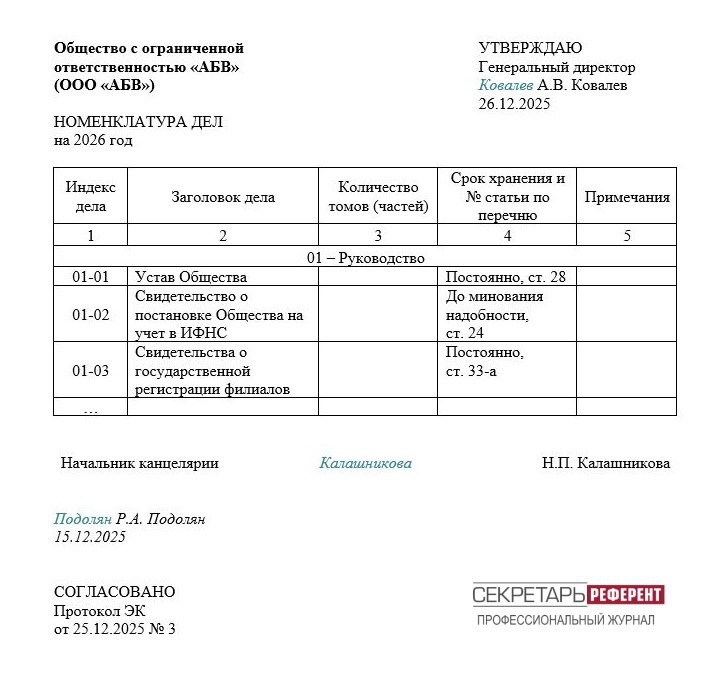 Фрагмент заполненной формы сводной номенклатуры дел представлен в Примере.