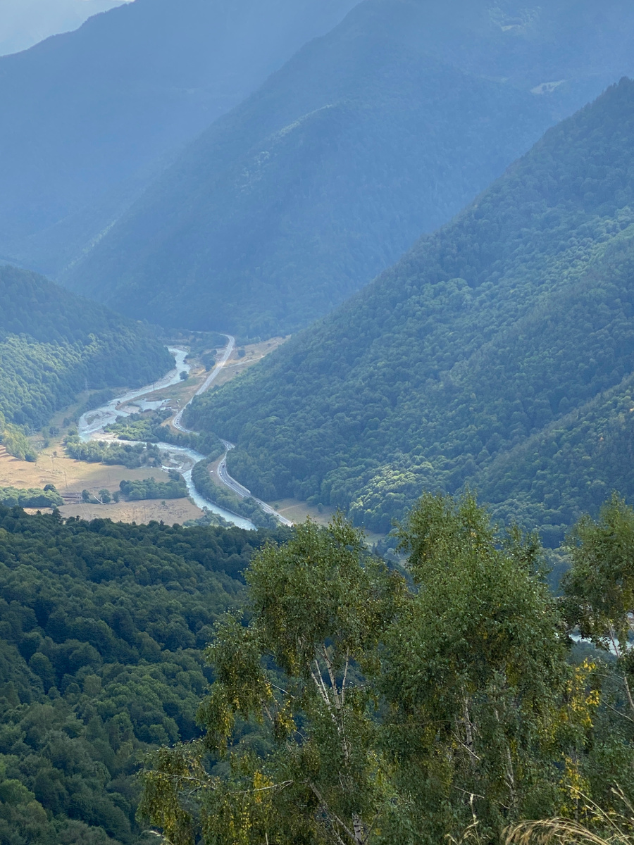 Что бы не завязываться на экскурс-бюро взяли напрокат машину на 4 человек и отправились в горы. На Домбае мы были в Новогодние праздники так же на машине из Москвы. Дорога красивая - серпантины, горы вокруг. Приехали и сразу на канатку до поляны с летающей тарелкой. Летом все совсем другое - бугель, который был по пояс зимой - теперь и не достать. Спустились и пошли обедать в кафе "У Зули". Помнится зимой в день приезда зашли туда голодные и назаказывали шурпу, хычины, салаты и колбаски. Официант приняв заказ спросил - вы еще кого-то ждете? И принес столько всего, что мы потом в отеле еще два дня ели. Пофотографировались и двинулись в соседнее ущелье в Архыз. Там мы заранее запланировали подъем в обсерваторию что бы ночью посмотреть на звездное небо - но не повезло - затянуло небо облаками. Долгий подъем по серпантину на площадку обсерватории и экскурсия внутрь гигантского телескопа. Масштабы поразили. На ночевку остановились в небольшом отеле около реки, пожарили ры