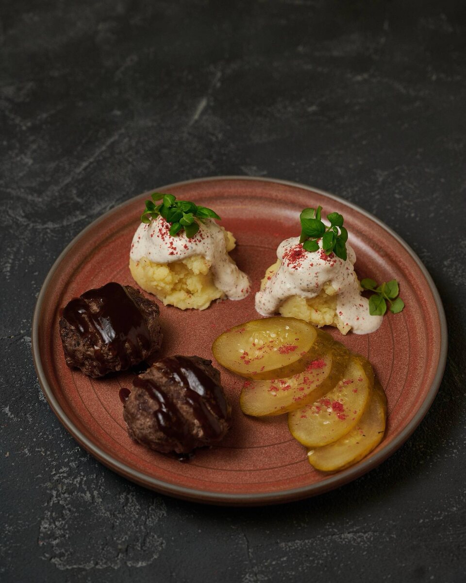 Нежные котлеты из мраморной говядины, домашнее пюре, сычуанский и перечный соусы — два настроения в одной тарелке: пряная остринка и глубокий мясной вкус. А маринованный огурчик и паприка добавляют ту самую нотку уюта и ностальгии.
