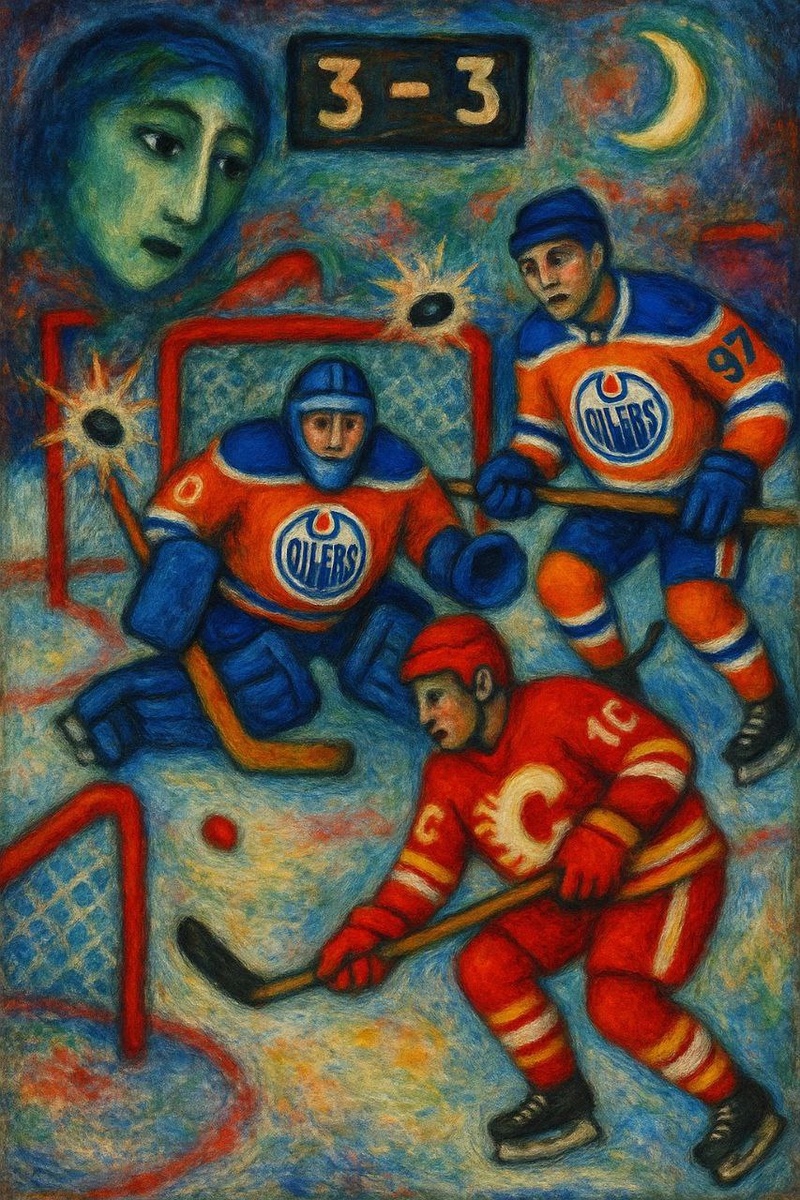 К середине матча финалист недавнего Кубка Стэнли Эдмонтон вел 3:0 в "битве за Альберту" с Калгари. Однако Флеймз умудрились сравняться, пускай и вторая их шайба, засчитанная после видеопросмотра, может считаться легитимной с большой натяжкой. После огненного овертайма матч перешёл в серию буллитов, где Калгари был много лучше. Пускай судьба матча решилась лишь в восьмой серии бросков, но прежде Флеймз дважды попадали в штангу против одной перекладины у Ойлерз. В стиле Шагала