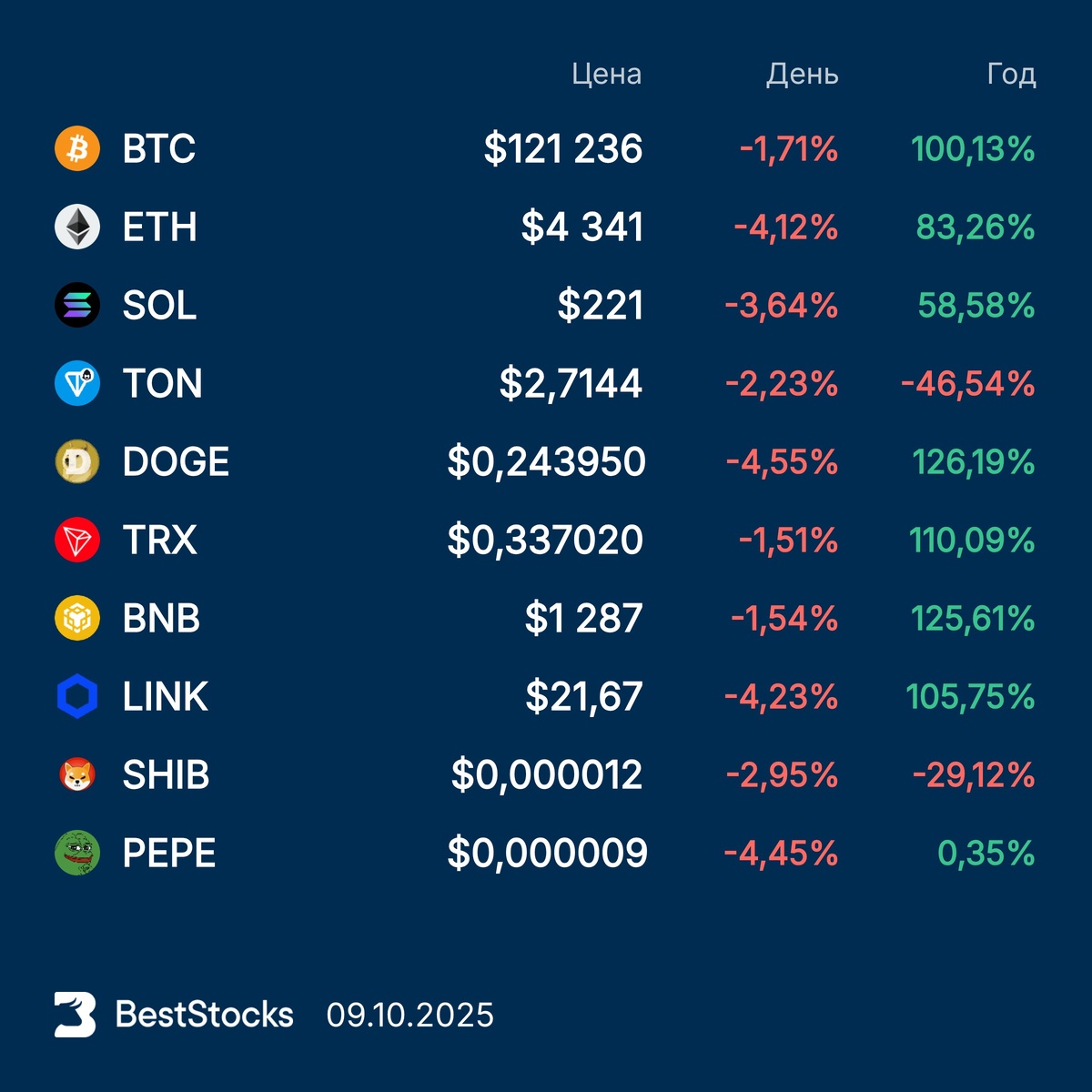 Курсы основных криптовалют: Bitcoin, Etherium, Solana, Toncoin, Dogecoin, TRON, BNB, Chainlink, Pepe, Shiba Inu на текущий момент #крипта #crypto #курс #BTC #ETH #SOL #TON #DOGE #TRX #BNB #LINKUSD #PEPEUSD #SHIBUSD ••••• 🆕 Новая фича на сайте — Тепловая карта рынка. Вы можете оценить динамику рынка в моменте: какие акции больше всего растут или падают, какие торгуются больше других. Всё это бесплатно и доступно без регистрации. Пользуйтесь!