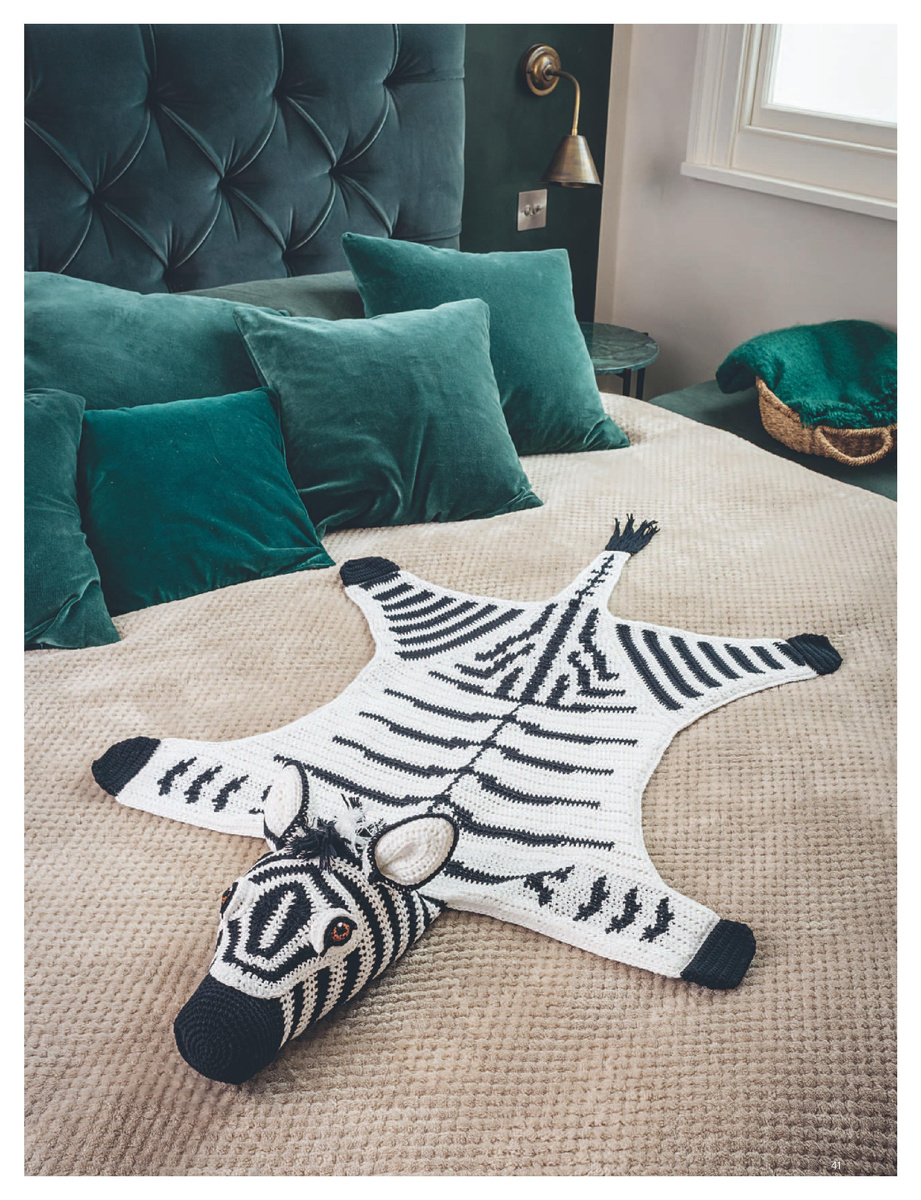 Тело и подкладка вяжутся крючком рядами из столбиков с накидом. Неиспользованная нить протягивается через петли по изнаночной стороне изделия при формировании полосок зебры. Тело и подкладка завершаются каймой из столбиков с накидом. Детали соединяются вместе одновременным провязыванием крючком каждой петли каймы как на теле, так и на подкладке. Копыта формируются путем провязывания петли в петли, соединяющие тело и подкладку, начиная с передних петель, затем поворота изделия и провязывания крючком непровязанных петель тех же столбиков. Они вяжутся рядами из столбиков с накидом.