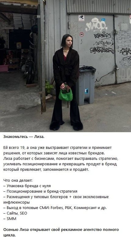 Незамутненная светлая муть. 19 лет, умеет упаковывать бизнес, распаковывать перспективы, выводить в ТОП и еще SEO. Учитесь, слабаки - это Лиза. Лиза уже все знает. Видите, как инфобиз работает - нужна просто Лиза. Какой-же бред. Мне каждый день пишут подобные Лизы с предложениями созвона, дабы раскрутить аудиторию на доп.инфо.услуги. Каждый день... Русский ИТ бизнес