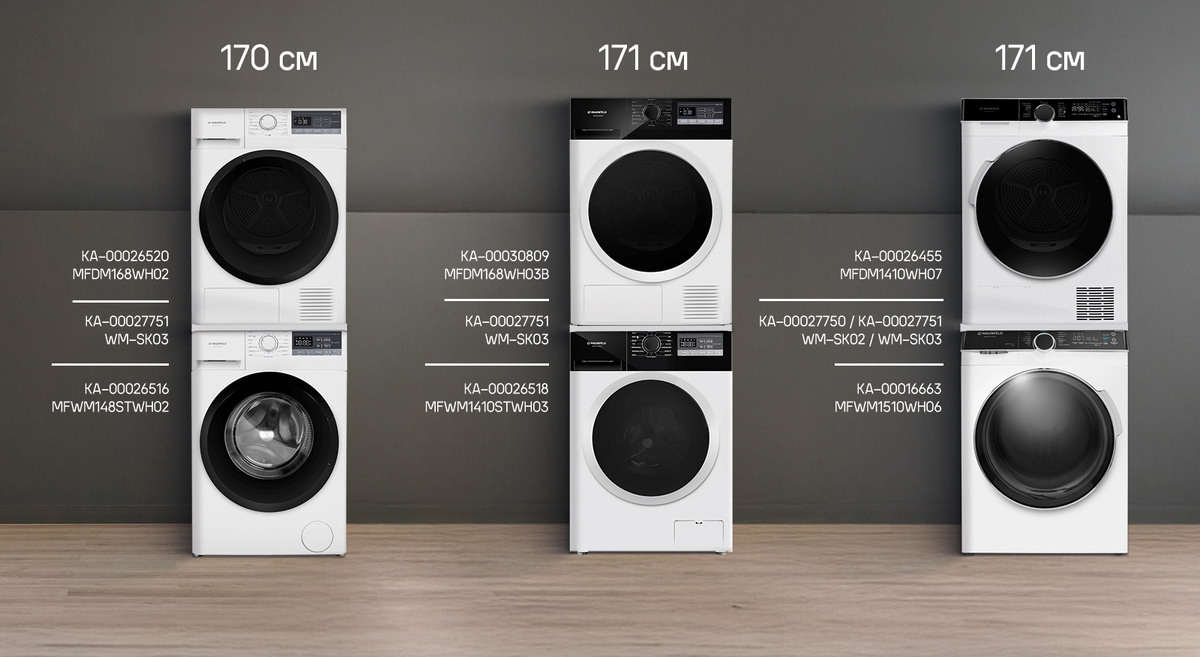 Организовать собственную прачечную дома теперь стало проще, чем когда-либо. Стиральные и сушильные машины MAUNFELD можно легко собрать в единый функциональный комплекс. Это готовое решение экономит пространство, повышает удобство и превращает рутинные дела в комфортный процесс. Организация стирки и сушки дома может быть не только удобной, но и максимально эргономичной. Решение от MAUNFELD — стирально-сушильные комплекты, которые позволяют собрать полноценную домашнюю прачечную даже на ограниченной площади. Стиральная и сушильная машины устанавливаются в колонну с помощью специального соединительного элемента. Такое решение экономит место, а в вашем распоряжении остаются сразу два полноценных прибора: стиральная машина для бережного и эффективного ухода за вещами и сушильная машина, которая обеспечивает идеальный результат без использования напольной сушилки. Установка техники в колонну позволяет рационально использовать даже небольшие помещения. Все процессы — стирка, сушка, сортировка
