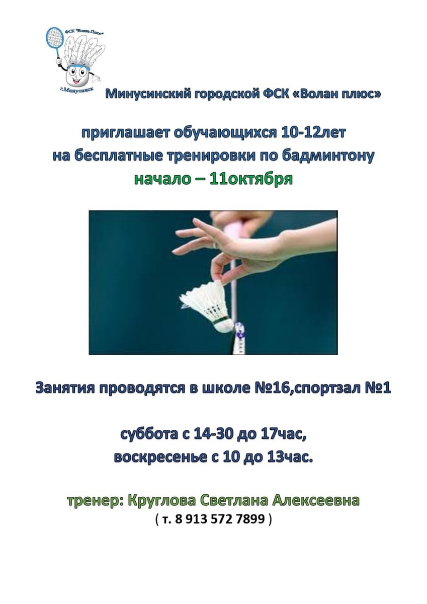 Минусинский физкультурно-спортивный клуб «Волан плюс» открывает набор ребят 10–12 лет на бесплатные тренировки по бадминтону Если ребёнок любит движение, скорость и азарт — самое время попробовать себя на корте. 📅 Старт занятий — 11 октября Школа №16, спортзал №1 Суббота — с 14.30 до 17.00 Воскресенье — с 10.00 до 13.00 Тренер — Круглова Светлана Алексеевна 📞 8 913 572 7899
