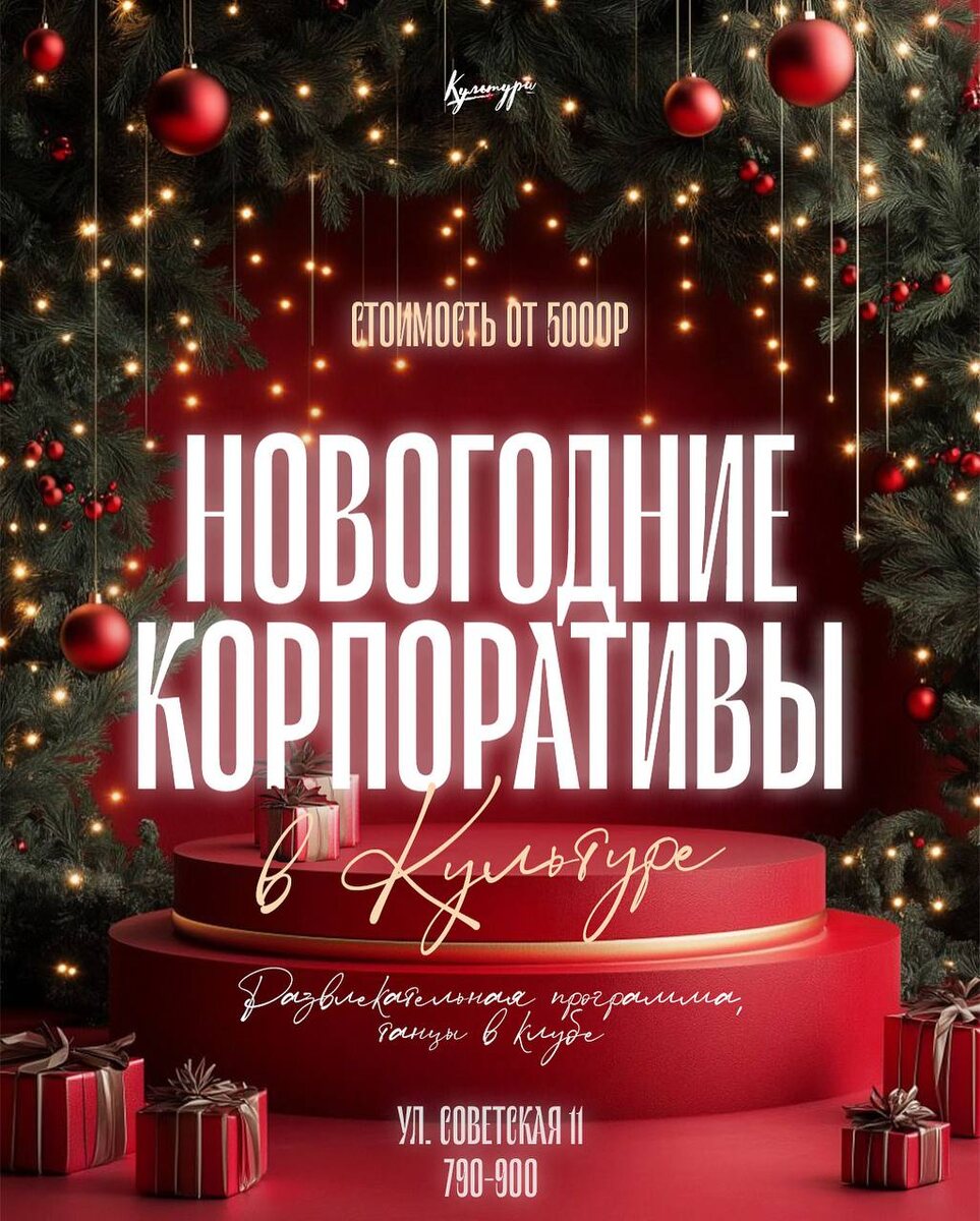 Открываем бронирование на новогодние корпоративы 🤩 В вашем распоряжении ресторанный зал вместимостью до 70 человек и полностью оборудованный светом и звуком клуб. Подготовили четыре часа развлекательной программы: 🤴 Герои из всеми любимого фильма «Иван Васильевич меняет профессию» 🎅 Поздравления и веселые конкурсы с Дедушкой Морозом и Снегурочкой 🐎 Танцуем, поем и водим хоровод с символом 2026 года — Огненным Конем 💃Зажигательные танцы в клубе под известные песни профессионального диджея Стоимость от 5.000₽ с человека. Более подробную информацию уточняйте по номеру: 790-900. Планируйте новогодние корпоративы заранее, ваша Культура 🤍