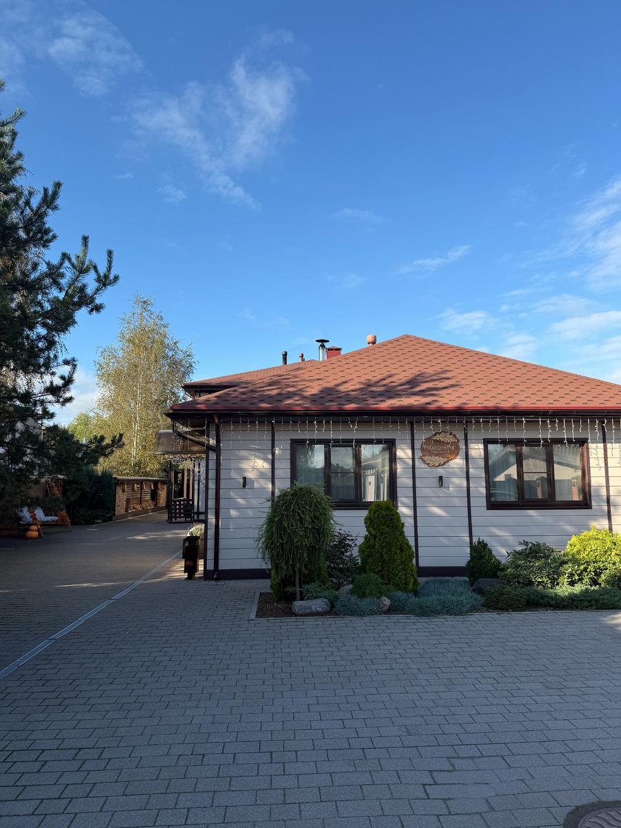 На днях я побывал в бане «Петергоф Пар». Находится она в Ленинградской области, деревня Санино, дом 35 — недалеко от самого Петергофа. Познакомился с баней сначала по фото в интернете и, честно говоря, подумал, что это скорее сауна, чем баня. Но когда приехал — приятно удивился. Здесь настоящие русские парные, качественный пар и дровяные печи Everest. Парные просторные и очень удобные для парения. Всё под рукой: горячая и холодная вода рядом, поддаёшь на печь и сразу работаешь веником. Парить можно и гостей — высота и ширина полков идеально подобраны. В комплексе всего четыре бани. Есть сеновалы, мангальная зона, качели, две фурако и даже детская площадка с турниками. Баня явно сделана с акцентом на семейный отдых — сюда спокойно можно приезжать с детьми. Мы сегодня отдыхали в большой бане, которую здесь называют клубной. Она рассчитана на компанию до восьми человек. Во входной группе — раздевалка, просторная, с большим зеркалом, феном и банными принадлежностями. В аренду уже входят та