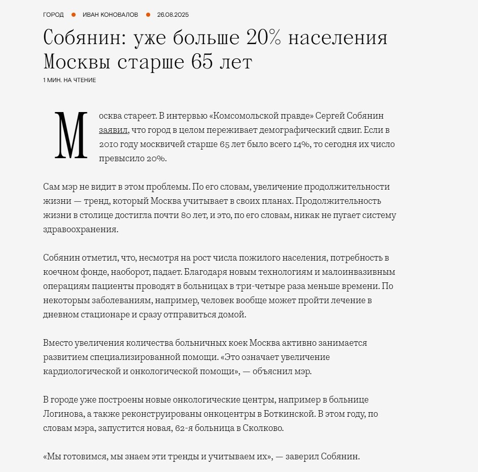 К 2055 году Москва станет первым российским мегаполисом, где почти каждый третий житель будет старше 65 лет, а к 2075 году город превратится в крупнейший в Восточной Европе геронтологический кластер с населением, медианный возраст которого достигнет 51 года. Это не кризис, а возможность создать новую модель городской экономики, “серебряную экономику”, объёмом до 4,7 трлн рублей ежегодно. Город, привыкший расти для молодых и активных, вынужден развернуться к своим стареющим жителям и новым мигрантам. Вопрос не в том, будут ли строиться новые небоскрёбы, а в том, кто сможет подняться на их верхние этажи без посторонней помощи.