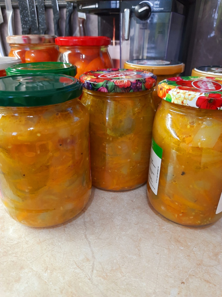 Я уже заквасила два ведерка зелёных помидоров, а они все не заканчиваются. Поэтому было решено приготовить салат на зиму. Выбрав из кучи подобных рецептов главную мысль, составила свой рецепт. Салат сразу готов к употреблению. Поэтому остатки, после раскладки по стерилизованным банкам я попробовала сразу, после остывания. И это оказалось очень вкусно: сочно, кисло-сладко. РЕЦЕПТ 0.5 стакана растительного масла 3 луковицы 2 кг зеленых помидоров 0.5 кг болгарского перца 0.5 кг моркови Уксус 6 ст. ложек Соль 2 ст. ложки Сахар 6 ст. ложек На дно кастрюли налить растительное масло. Выложить, нарезанный полукольцами лук, натертую морковь, помидоры, нарезанные дольками, перец, нарезанный кубиками. Добавить соль, сахар. Довести до кипения, помешивая. При необходимости (если мало сока) добавить 0.5 стакана воды. Тушить 15-20 минут на медленном огне. В конце влить уксус, хорошо перемешать. Разложить по банкам или есть сразу. Для любителей "поострее", можно добавить острый перец по вкусу