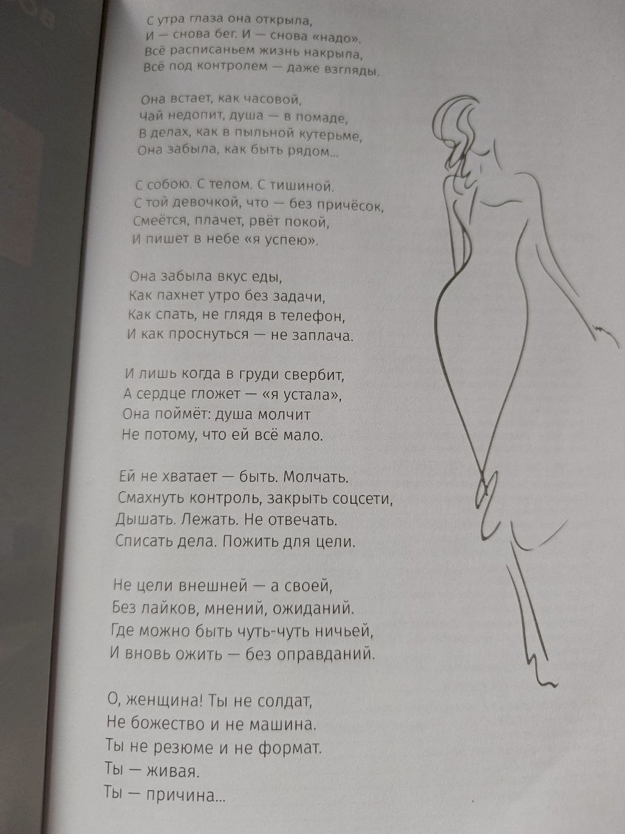 Дорогие, какой волшебный стих мне попался😍 К сожалению, автор неизвестен Но только вчитайтесь в эти строчки🤲 Мы живём из режима - надо Мы не позволяем себе - хочу Ей не хватает - быть. Молчать. Смахнуть контроль, закрыть соцсети Дышать. Лежать. Не отвечать До мурашек каждая строчка этого стихотворения🤗