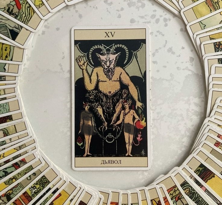 Карта Дьявол (XV Аркан) — одна из самых ярких карт, образ которой, был демонизирован голливудскими сценаристами. Несмотря на это, у этого Старшего Аркана есть огромное количество символики и смыслов, и он является ключом к пониманию нашей сконцентрированной воли и личного развития. Автор колоды Уэйт (Уайт) описывал основные элементы карты: Главное действующее лицо — рогатый козел Мендеса, который является воплощением дракона бездны. Карта имеет явную композиционную связь с VI Арканом (Влюбленные). На ней изображены две фигуры (мужская и женская), словно Адам и Ева после грехопадения. Мужчина и женщина прикованы цепями за шею к алтарю. Это символизирует фатальную обреченность материальной жизни и прикованность человека к желаниям своего тела, своей плотской сущности. В левой руке Дьявола пылает опущенный к земле огромный факел. Этот факел символизирует просвещение, просветление, зарождение идеи в умах других людей. Символика факела коррелирует с понятием огня как идеи, которая охватывае