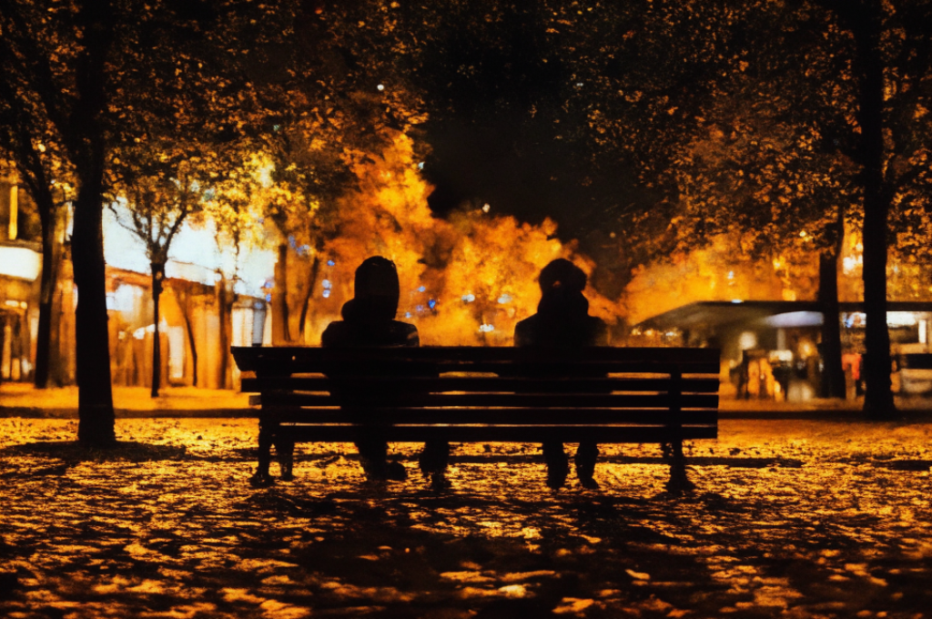 Двоих обдувает ветром. Людей вокруг меньше, почти никого. Но кто-то вон вышел с собакой. Кто-то с ребёнком домой возвращается. Смотрят оба на это и им сразу уютнее. Не одни они в темноте. И лавка лишь часть мира большого.