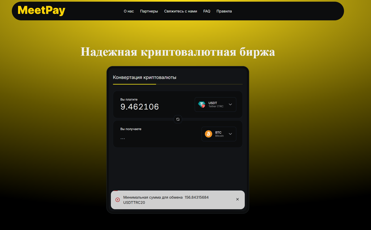 Проект meetpay io позиционируется как обменник или финансовый сервис, который предлагает быстро конвертировать крипто- или фиатные валюты, обещания “быстрых транзакций”, удобства и безопасности. На сайте и в маркетинговых материалах утверждается, что MeetPay — надёжная платформа для обменов, с защитой, SSL, современными протоколами безопасности.