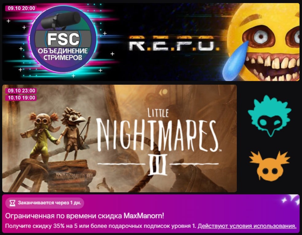 📢🤩🤩🤩🤩🤩💁♀️ ❗️ ИЗМЕНЕНИЯ В РАСПИСАНИИ!!! 💰 СКИДКА НА ПОДАРОЧНЫЕ ПОДПИСКИ 35%!!!! 😀😀 - ЛУТАЕМ НОВЫЕ ЗНАЧКИ 📆 СЕГОДНЯ: ⏰ В 20:00 🎮 Игра: R.E.P.O. 💜 КООП [FSC] 💜 🤣 Экспресс зачистка. 📜 Участники: - MaxManorn - stervunya - Snolleth - preoccupied_panda - Koshak087 ⏰ В 23:00 (ориентировочно) 🎮 Игра: Little Nightmares III 💜 КООП [FSC] 💜 Мы погружаемся в игру а вы лутаете значки 😀😀! 📜 Участники: - MaxManorn - stervunya 📆 ПЯТНИЦА 10.10.25: ⏰ В 19:00 🎮 Игра: Little Nightmares III 💜 КООП [FSC] 💜 Мы погружаемся в игру а вы лутаете значки 😀😀! 📜 Участники: - MaxManorn - stervunya 😀 Новый значок «Alone» за платную подписку 😀 Новый бесплатный значок «Low» за просмотр трансляции 30мин. Отслеживать прогресс получения значка можно во вкладке — Drops → Инвентарь 1️⃣ Приходите смотреть на Twitch и ставь ❤️ на VKВидеоLive!! ⏺ Все наши ресурсы.
