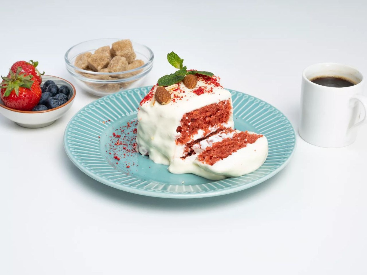 Торт «Красный бархат» в форме сердца состоит из нежных коржей красного цвета и из потрясающе вкусного фисташкового крема. Чтобы создать форму сердца, понадобится бумажный трафарет. Его можно вырезать произвольно из обычной офисной бумаги. Необходимо, чтобы на бисквите поместилось не меньше двух сердечек. Таким образом получатся идеальные коржи для торта в виде сердца, которые имеют и прекрасный боковой срез, и форму. Для украшения мелко порубите изумрудные фисташки и посыпьте ими торт.