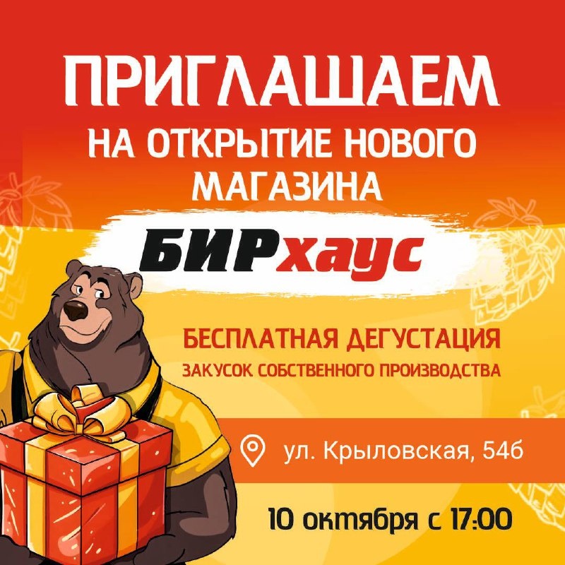🎉 10 октября в 17:00 по адресу ул. Крыловская, 54Б состоится открытие БИРцеха! 🍺 #БИРцех — это не просто закуски к пиву, а вкусная продукция, приготовленная с любовью и заботой о качестве ❤️ ✨ На дегустации вас ждёт: 🍟 Фри-продукция — от ароматной картошки до мойвы в панировке 🥖 Хрустящие гренки собственного производства с чесночным соусом Приходите, пробуйте, знакомьтесь с ассортиментом и атмосферой БИРцеха! Ждём вас 🙌