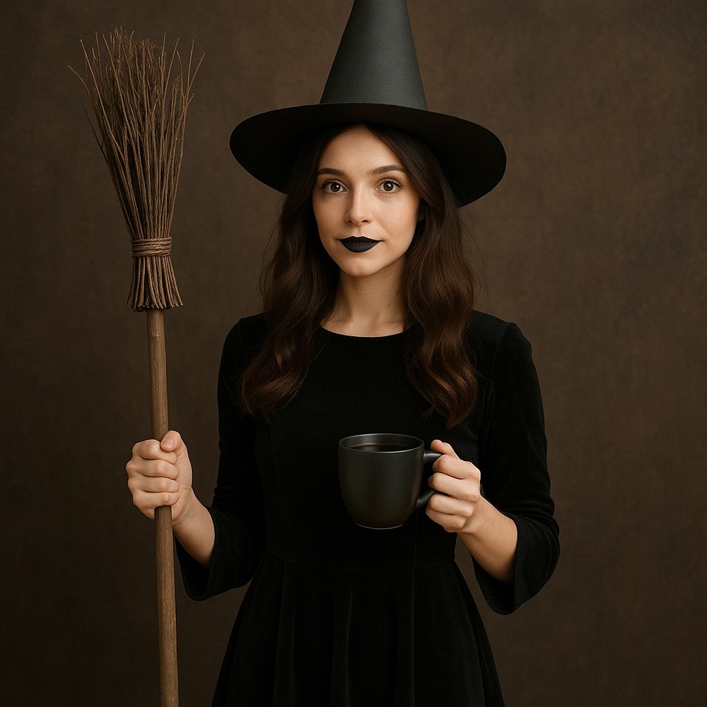 Добавь цепочку или фонарик в руку — и получится жутко стильно. 💡 Совет: если хочешь оригинальности, используй кружевную ткань или добавь грим с белым тоном лица. Чёрное платье, шляпа (можно сделать из картона), немного тёмной помады — и ведьма готова колдовать!