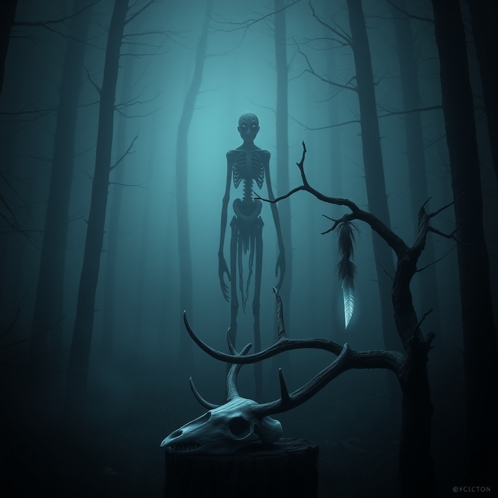 Это была не пещера. Это была поляна, превращенная в кошмарную галерею. В центре — скелет лося, причудливо украшенный. В его рогах, вплетённой в кости, — светилась светящаяся нервная система Семена, натянутая между рогами как струны арфы. Вокруг — другие «скульптуры» из костей и внутренностей мелких животных. Это было не просто место убийства — это мастерская художника из ада.