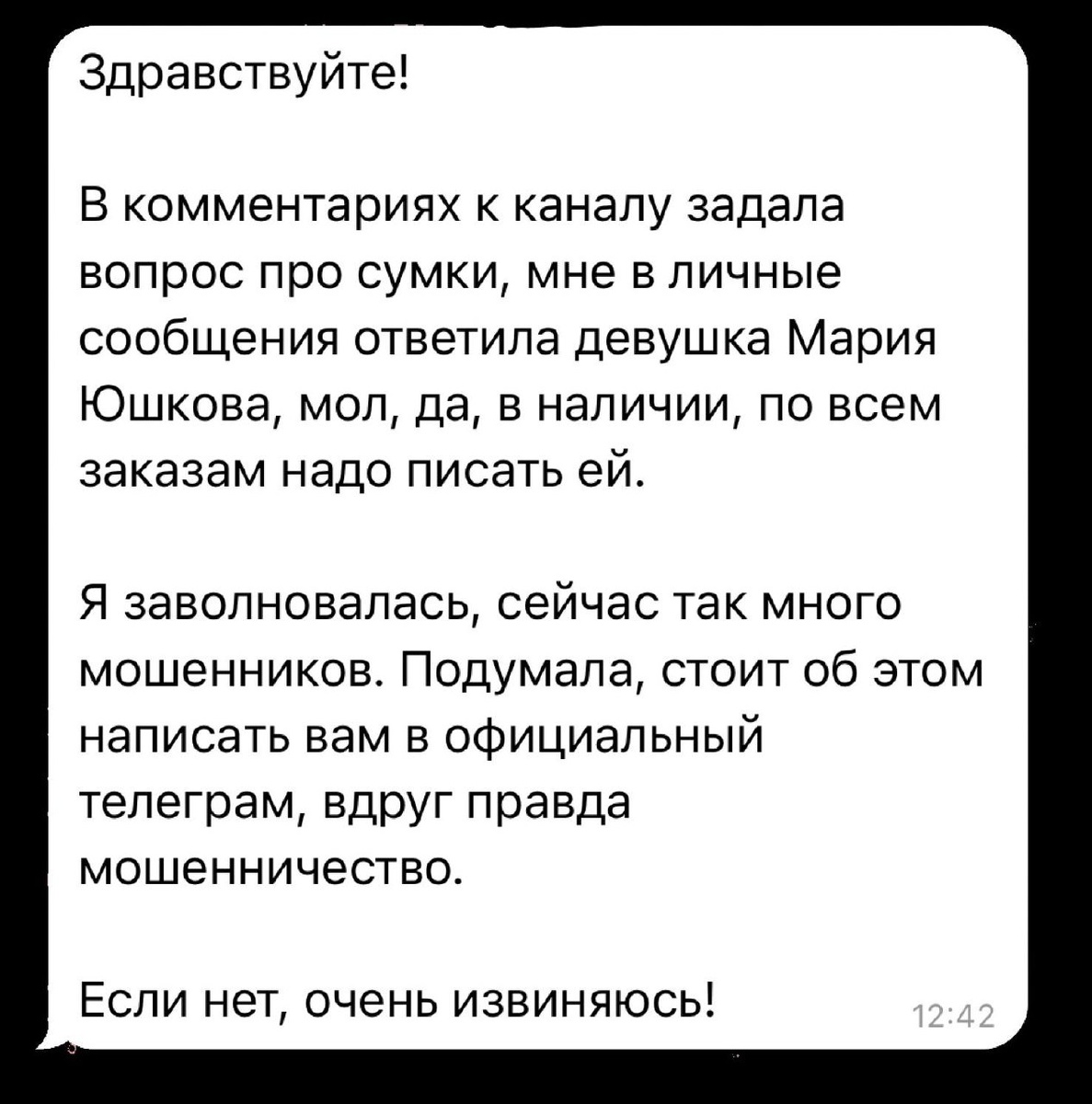 Вот и до нас добрались мошенники 💔 Благодарим за бдительность нашу подписчицу и призываем вас также внимательно относится к подобным сообщениям. Мы не принимаем заказы через личные сообщения, а написать вам можем только с наших официальных каналов связи, все они указаны на сайте и в наших соцсетях 🌷