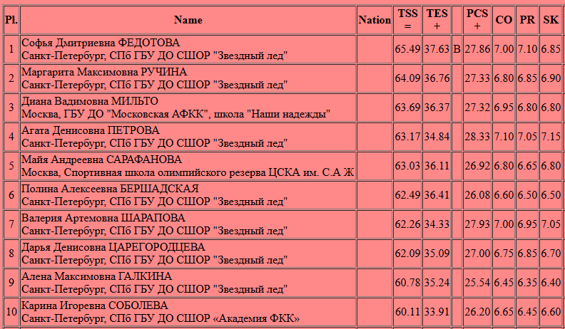 Это всего лишь короткая программа, произвольная многое изменит, но впечатляет лидерство Софьи Федотовой (65.49 - 1 место) и Маргариты Ручиной (64.09 - 2 место), фамилии которых даже у опытных болельщиков могут вызвать вопрос "кто эти фигуристки?". Маргарите 14 лет и в ее активе на данный момент из главных всероссийских стартов 18 место на старшем Первенстве России 2 года назад. Ученице Ольги Ефимовой Софье Федотовой 13 лет, а на главных всероссийских стартах она была замечена первый и последний раз 3 года назад, когда стала 14-й на младшем Первенстве России. Сами можете понять, что лидерство Софьи и Маргариты впереди Дианы Мильто, Агаты Петровой, Майи Сарафановой, Валерии Шараповой стало большой сенсацией. Смотрим прокат лидера.