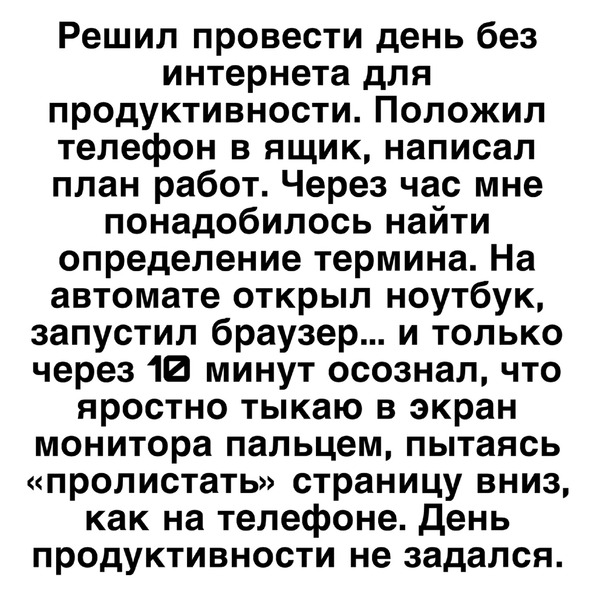 Решил провести день без интернета для продуктивности. Положил телефон в ящик, написал план работ. Через час мне понадобилось найти определение термина. На автомате открыл ноутбук, запустил браузер... и только через 10 минут осознал, что яростно тыкаю в экран монитора пальцем, пытаясь «пролистать» страницу вниз, как на телефоне. День продуктивности не задался.