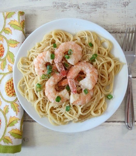 Ингредиенты: 225 г спагетти 1 столовая ложка оливкового масла 2 столовых ложки сливочного масла 1 столовая ложка выдавленного чеснока щепотка хлопьев красного перца 450 г очищенных креветок цедра и сок лимона 2 столовых ложки нарубленного лука 4 столовых ложки тертого пармезана Приготовление: Отварите пасту согласно инструкциям на упаковке до состояния аль-денте. Нагрейте оливковое и сливочное масло (по 1 столовой ложке) и обжарьте чеснок с хлопьями красного перца. Готовьте пока сливочное масло не растопится, затем выложите на сковороду креветки. Обжаривайте, помешивая, пока креветки не изменятся в цвете. Затем добавьте цедру, сок и вторую ложку сливочного масла. Помешивайте, когда масло растопится, добавьте лук и пасту. Перемешайте. Присыпьте тертым пармезаном.