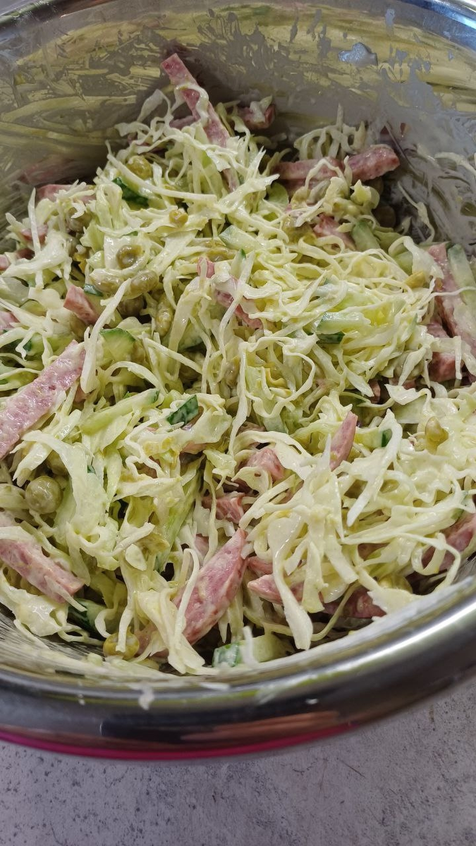 🔸 Капуста – 300 г 🔸 Колбаса п/копчёная – 200 г 🔸 Огурец – 1 шт. 🔸 Горошек консервированный – мал. баночка 🔸 Майонез Капусту натёрла на тёрке и сложила в миску. Огурец и колбасу нарезала соломкой и добавила в миску с капустой. С горошка слила жидкость и добавила к овощам. Заправила майонезом и перемешала. Соль по вкусу, если нужно – посолить. Салат готов, сытный и вкусный 💪