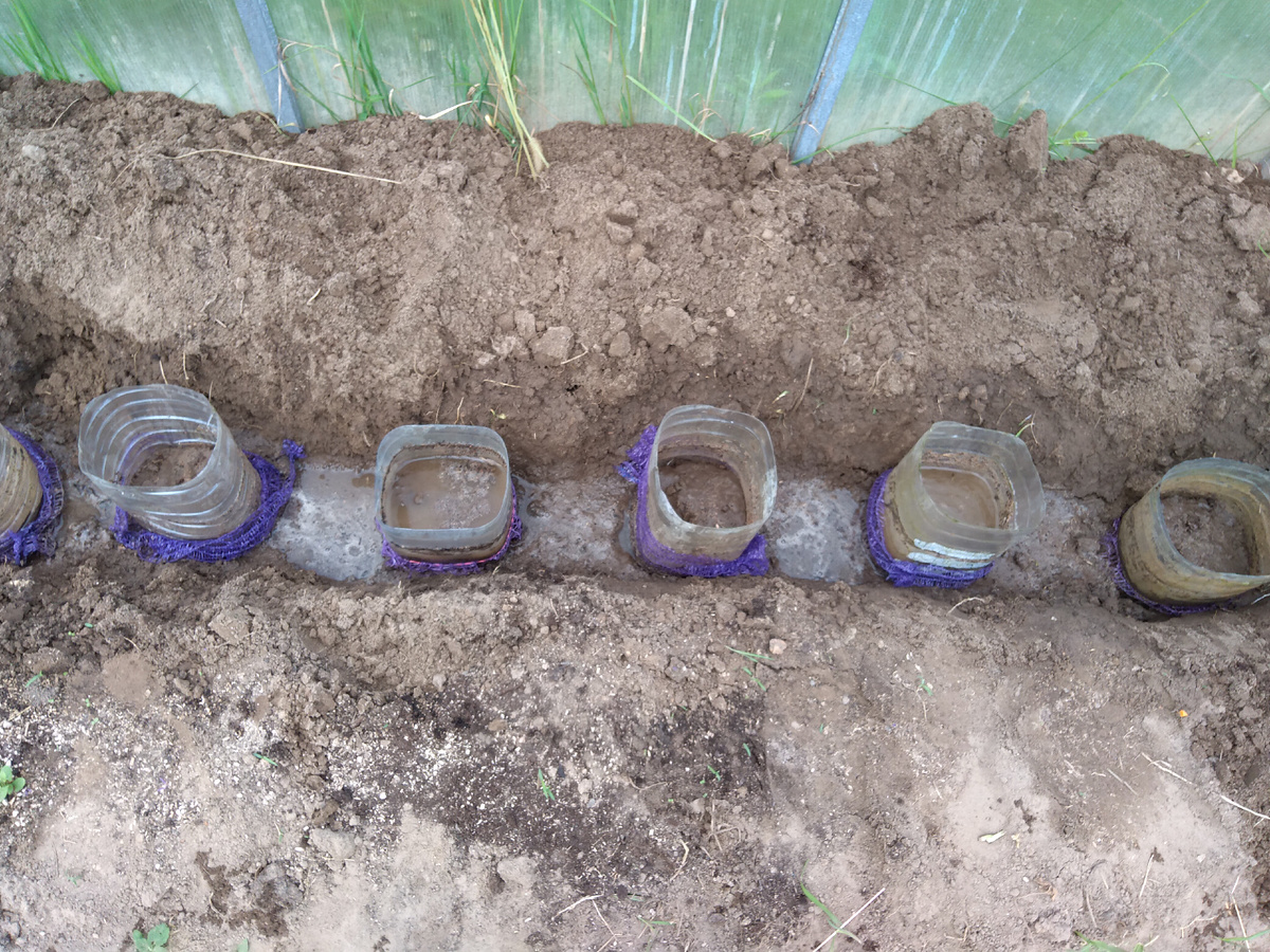 Копаем лопатой траншею, сыпем нитроаммофоску(16/16/16) 50гр на погонный метр, если было магниевое голодание то +5 гр/пм сульфата магния, заливаем её водой до верха и по грязи раскладываем куски сетки от магазинной картохи. Делаем цилиндры из ёмкостей воды в 5 л(фото, верх и попа срезаны) и плотно втрамбовываем из в грязь поверх сеток. Насыпаем земли внутрь и сажаем огурцы семенами. Огурцы лучше разместить посередине теплицы, если у вас там и томаты и перцы и зелень и т.д. И да! Такая посадка позволяет выращивать ВСЕ КУЛЬТУРЫ в одной теплице! Т.к. так сажал первый раз-посадка вышла загущённой. По возможности, между каждой ёмкостью д.б. 2! её размера.