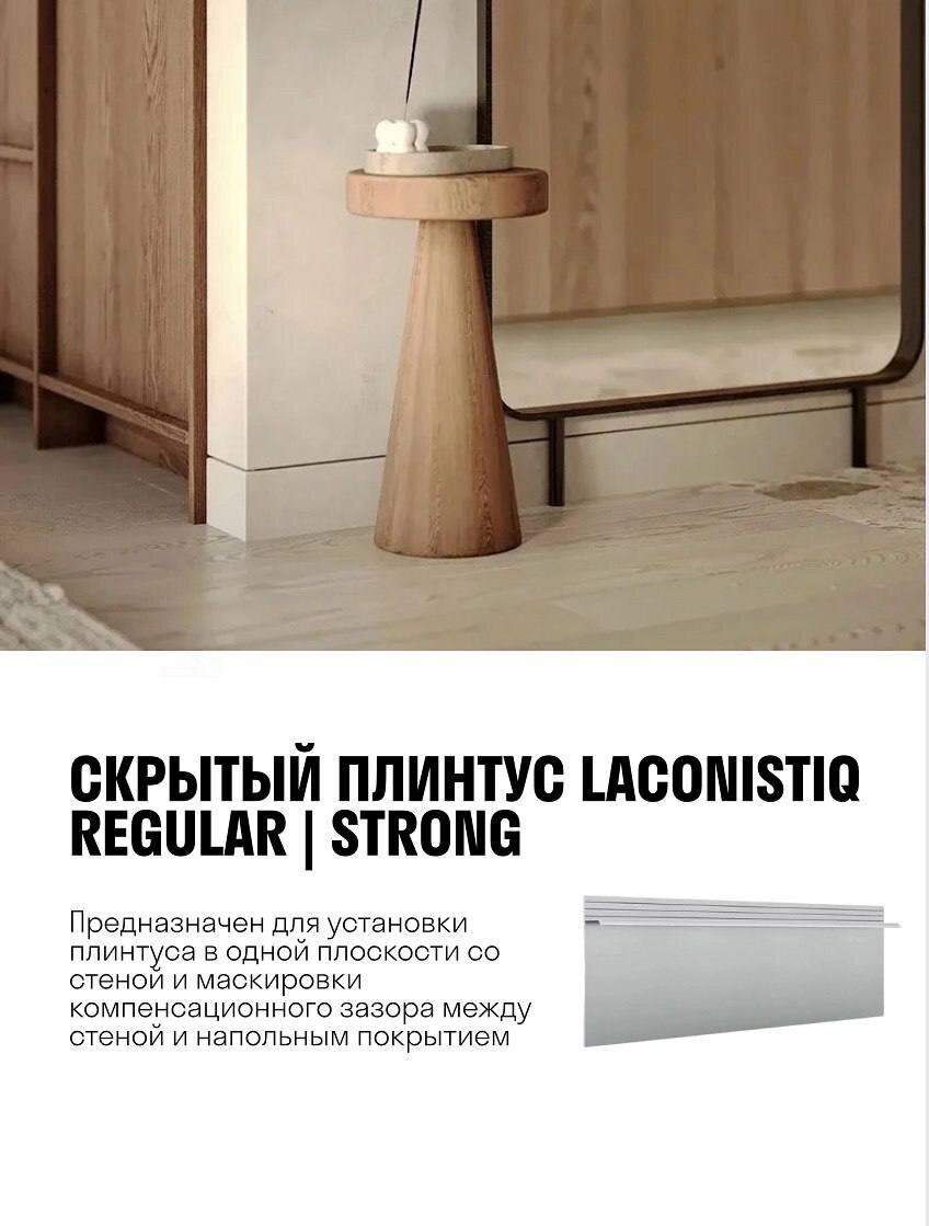 Они маскируют стык между стеной и полом, визуально увеличивают пространство и создают ощущение чистоты и минимализма Две основные модели: REGULAR • Позволяет создать аккуратный интерьер без лишнего визуального шума. • Вставка из полистирола высокой плотности устойчива к влаге и деформации. • Возможна установка светодиодной ленты (120 светодиодов на метр, без рассеивателя). • Длина профиля — 3 метра. • Цвета: чёрный муар, чёрный матовый, без покрытия (для окраски), окраска по RAL. STRONG • Жёсткая конструкция с бортиком для армо-пояса и увеличенной площадкой для фиксации стекло-холста. • Вставка из плотного полистирола, устойчивая к влаге (ширина 80, 100, 120 мм). • Возможна установка светодиодной ленты 120 шт./м. • Длина профиля - 3 метра. • Цвета: чёрный муар, чёрный матовый, без покрытия, окраска по RAL. Скрытый плинтус помогает сделать интерьер «без плинтуса» - лаконичным, аккуратным и технологичным.