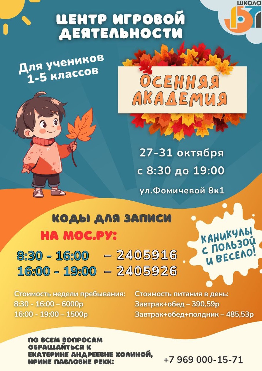 🎉Подарите своему ребенку незабываемые каникулы — яркие, полезные и насыщенные впечатления! 🫱Приглашаем детей 1-5 классов в наш центр игровой деятельности «Осенняя академия юного исследователя», где их ждут: 👉увлекательные занятия, 👉интеллектуальные игры, 👉мастер-классы, 👉спортивные мероприятия, 👉творческие проекты. Пока вы работаете, ваш ребенок будет в надежных руках 👐 учиться, играть и развиваться в дружелюбной и вдохновляющей атмосфере. «Отличная возможность развить интерес к учебе, познакомиться с новыми друзьями и получить много ярких эмоций!» – Ирина Ильинична Корнева, руководитель дополнительно образования. ☝️Количество мест ограничено – не упустите шанс! Запишитесь уже сегодня и подарите своему ребенку веселое и полезное осеннее времяпрепровождение! #ДОНМ #ДопОбразование