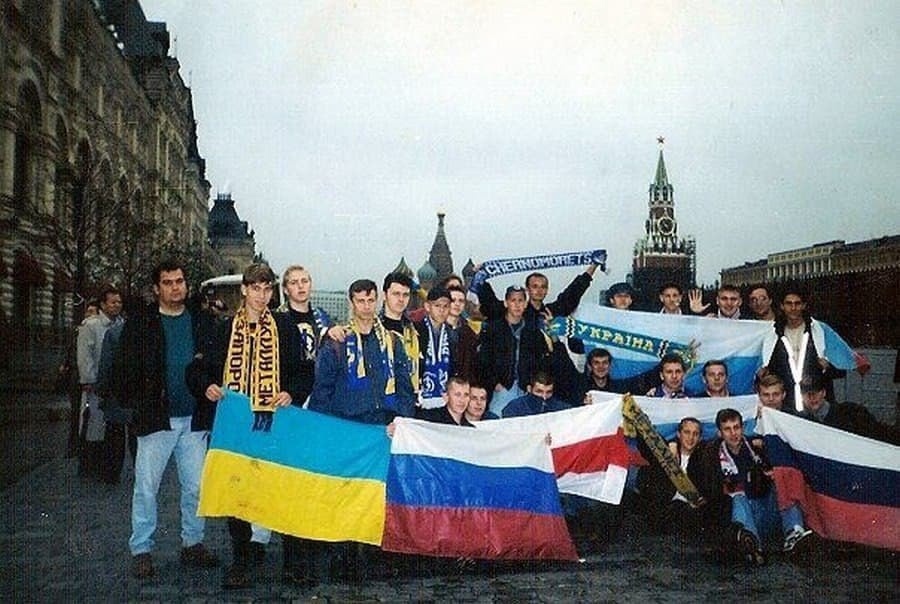 Матч Россия - Украина. 9 октября 1999 года Москва. 9 октября 1999 года. 26 лет назад. Фанаты сборной Украины, болельщики сборной России и туристы из Беларуси за несколько часов до матча Россия - Украина.