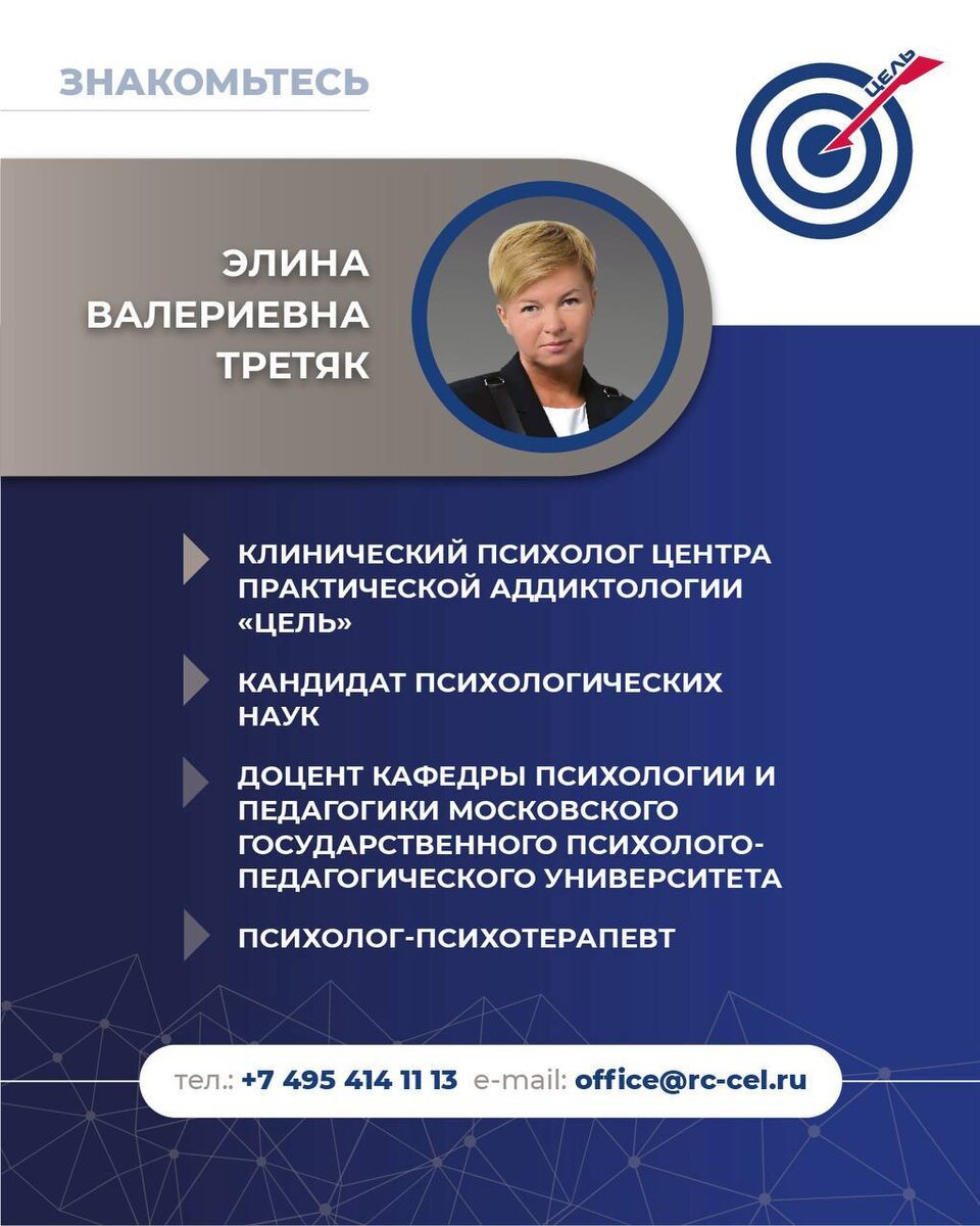 Дорогие подписчики, представляем вам нашего специалиста — Третяк Элину Валериевну. Элина Валериевна является доцентом кафедры психологии и педагогики Московского государственного психолого-педагогического университета, кандидатом психологических наук, клиническим психологом центра «Цель» и психологом-психотерапевтом, обладающим богатым опытом работы в сфере психологии и реабилитации. Стремясь к индивидуальному подходу, Элина Валериевна адаптирует свои методы работы, в зависимости от потребностей и особенностей каждого клиента. В нашем центре Элина Валериевна проводит терапевтические сессии, индивидуальные и групповые консультации, а также занимается разработкой программ психологической поддержки для резидентов. Мы рады, что у нас в команде есть такой замечательный специалист, как Элина Валериевна, и уверены, что ее опыт и знания будут помогать нашим клиентам на пути к выздоровлению и лучшему качеству жизни. С уважением, Центр «Цель»