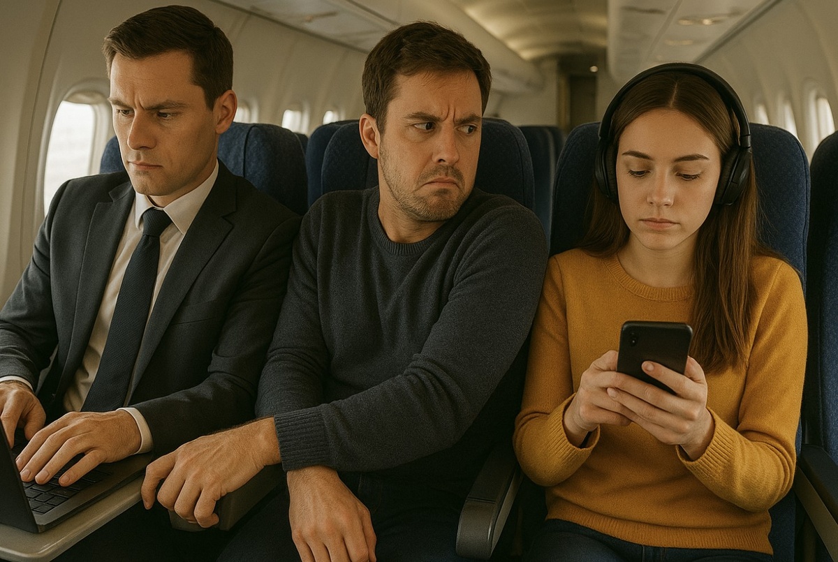 Слева от меня устроился мужчина в деловом костюме — типичный офисный хищник, который всё делает уверенно, будто даже в эконом-классе летит по личному распоряжению директора. Справа — молодая женщина в наушниках, глядящая в телефон, как в параллельную реальность.