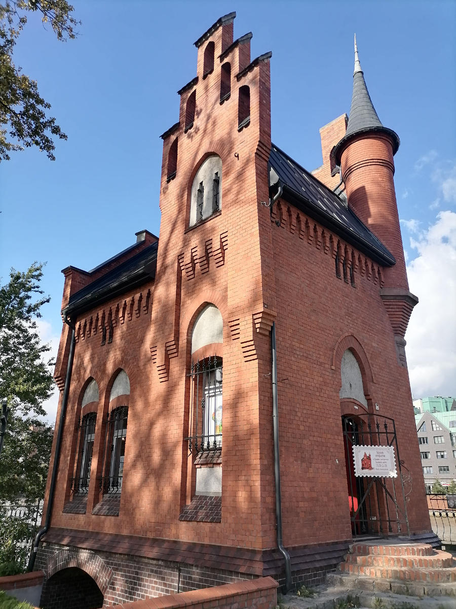 Домик смотрителя Высокого моста - как маленький замок, расположенный прямо на берегу реки Преголя.