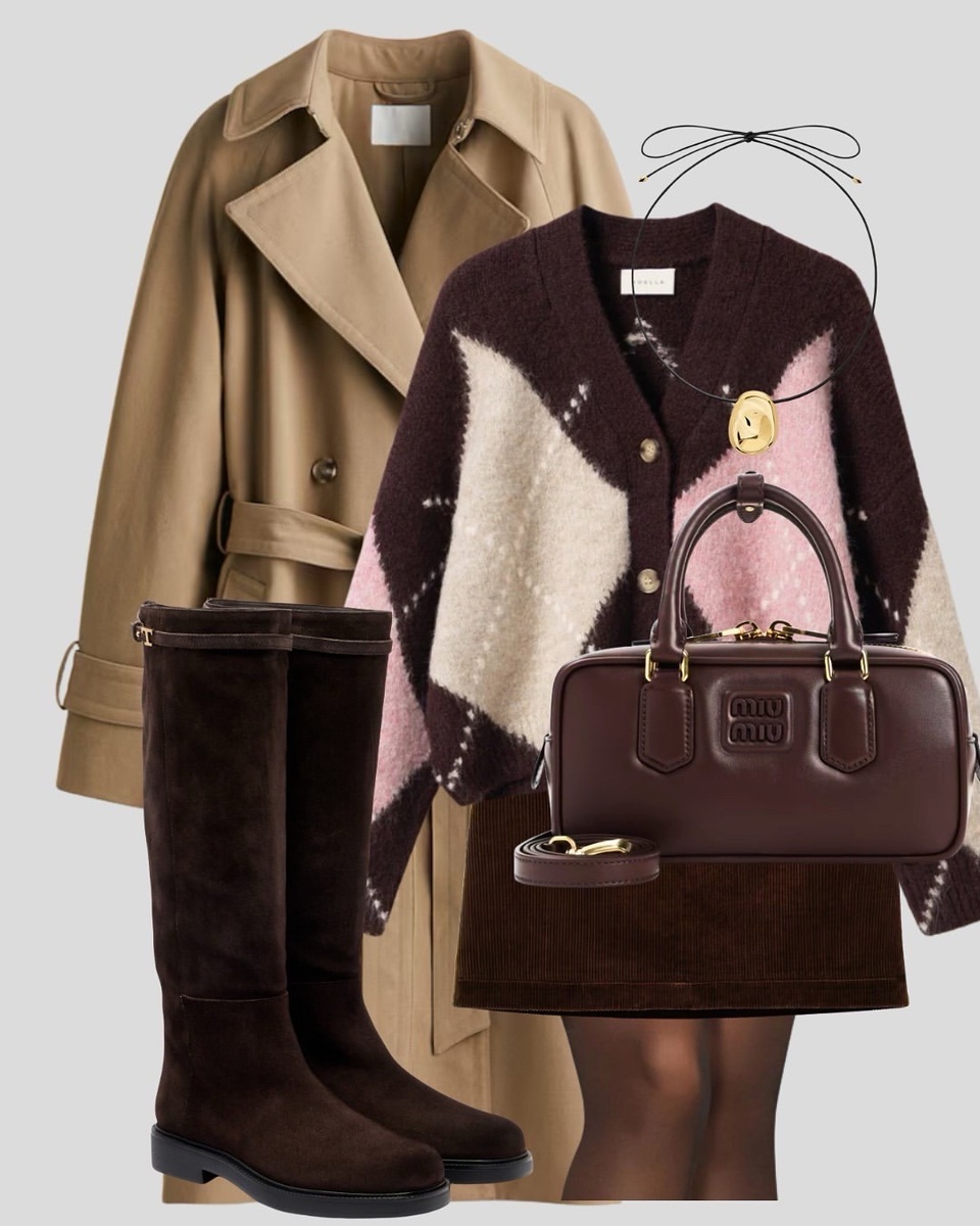 Иногда достаточно одного правильного сочетания фактур и оттенков, чтобы образ зазвучал как музыка. Перед нами — идеальный пример «тихой роскоши»: карамельное пальто, пушистый кардиган с крупными ромбами, шоколадный вельвет, замша и тёплый металл в фурнитуре. Разберём комплект по деталям и сразу дадим рабочие подсказки стилиста — как носить, что подчеркнуть и на чём сделать акцент.