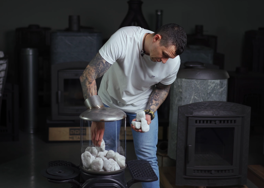 Основание и верх стандартные, а боковые стенки — прозрачные, чтобы было видно, как правильно укладывать наполнение. Для примера мы используем белый кварц — камень красивый, но не лучший вариант для внутренней каменки. Он не выдерживает высоких температур, со временем трескается и крошится. Выбрали его лишь ради демонстрации и потому что гармонирует с футболкой автора. В конце статьи расскажем, какие камни лучше всего подходят для внутренней каменки не только печей Атмосфера, но и любых других банных печей. Главная особенность печей Атмосфера — внутренняя нержавеющая Каменка.
