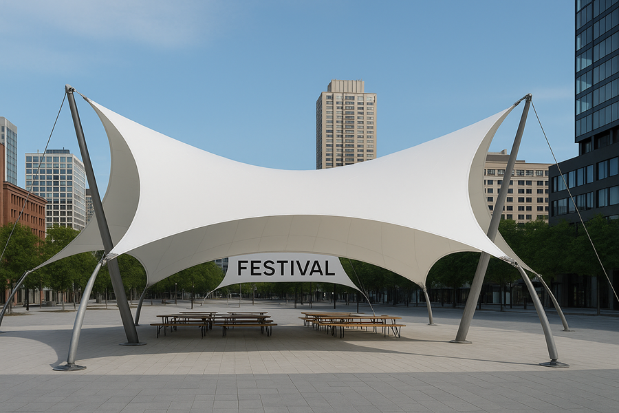 Тентовые конструкции позволяют буквально «выростить» пространство под конкретную задачу — от летней террасы кафе до крытой ярмарки или павильона для лекций. Преимущество тентов в их мобильности и масштабируемости. Они быстро устанавливаются, не требуют массивных фундаментов и при этом выглядят современно. Архитекторы всё чаще используют их как модульные элементы город