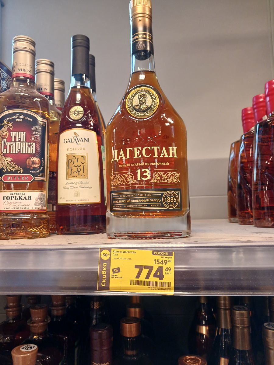 Здравствуйте, дорогие друзья! Московская область. Условно - одна из 15 Пятёрочек выдаёт хорошие скидки на алкогольные напитки. Где-то вино, а где-то коньяк и пиво. Российский коньяк Дагестан 13. 774₽ за 0,5 литра. Хорошая цена, несколько лет назад этот коньяк приятно удивил. Армянский коньяк Фрунзик Мкртчян XO 10. Заявлено 10 лет выдержки. 651 рубль за 0,5 литра. Минимальная розничная цена установленная государством. Армянский коньяк Арарат Ахтамар 10. 1300 за 0,5 литра. Хорошая цена, но в Магнитах ещё попадается 0,7 литра по сопоставимой стоимости. Johnnie Walker Black Label 12 по 1300 за 0,7 литра. Последняя бутылка. Левее стоит ирландский виски по 661 за 0,7. Розлив за пределами Ирландии, если не ошибаюсь. Шотландский виски с розливом во Франции - Label 5. Шашлычный вариант за 661 рубль. 0,7. Мексиканская текила из Бельгии по 699 рублей. Шведская водка Абсолют по 649 за 0,5. Ещё Finlandia по 549, Мамонт по 499 и Белые росы по 599. Все объёмом 0,5 литра. Пиво Афанасий со скидкой 5