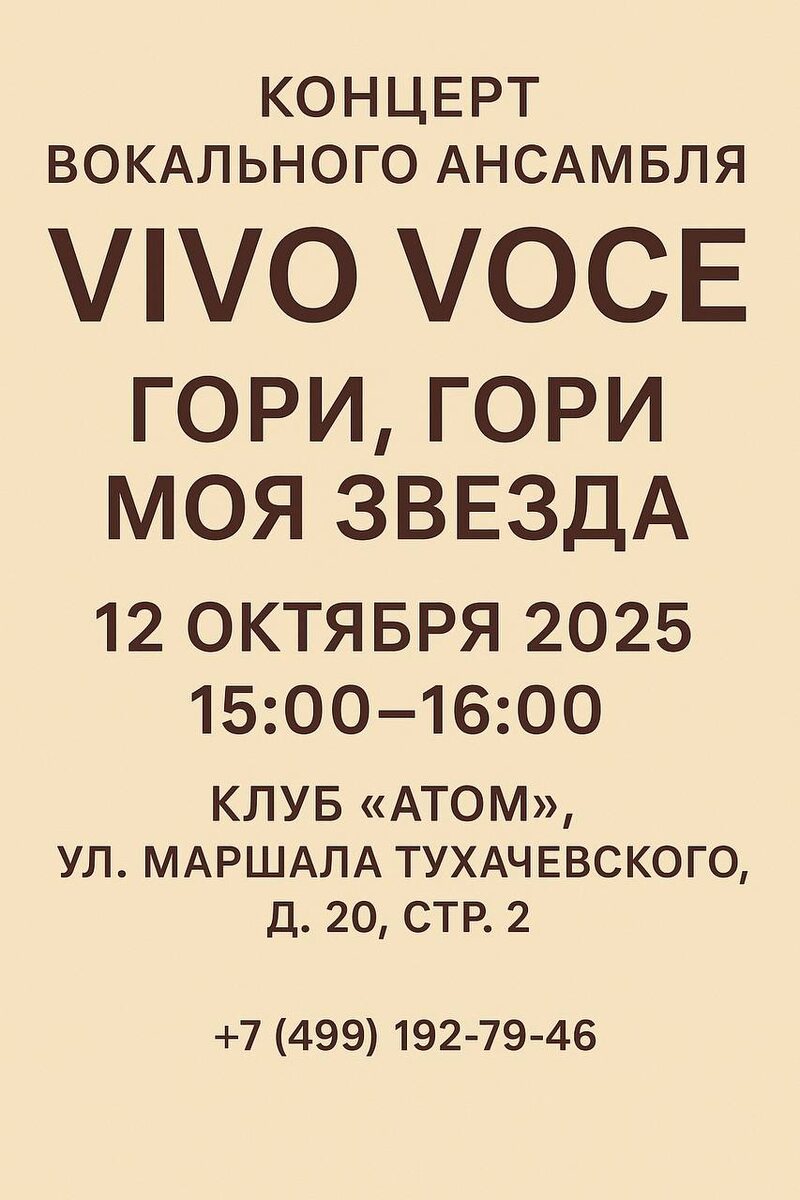 🎶 Концерт вокального ансамбля «Vivo Voce» — «Гори, гори, моя звезда» 📅 12 октября 2025 🕒 15:00–16:00 📍 Клуб «Атом», ул. Маршала Тухачевского, д. 20, стр. 2 (ГБУ г. Москвы «ОКЦ СЗАО») 📞 +7 (499) 192-79-46 💸 Вход свободный 🔞 18+ ✨ Вас ждёт музыкальный вечер, наполненный красотой академического вокала и глубокими эмоциями. Ансамбль «Vivo Voce» представит программу, в которой прозвучат авторские аранжировки и классические вокальные произведения. 💫 Профессиональное мастерство, выразительная подача и гармоничное звучание сделают этот концерт настоящим праздником для любителей музыки. 📸 Фото #Москва #СЗАО #ХорошевоМневники #КлубАтом #VivoVoce #Концерт #АкадемическаяМузыка #ЖиваяМузыка #КультураМосквы #МузыкальныйВечер #Бесплатно #АфишаМосквы #ОКЦСЗАО