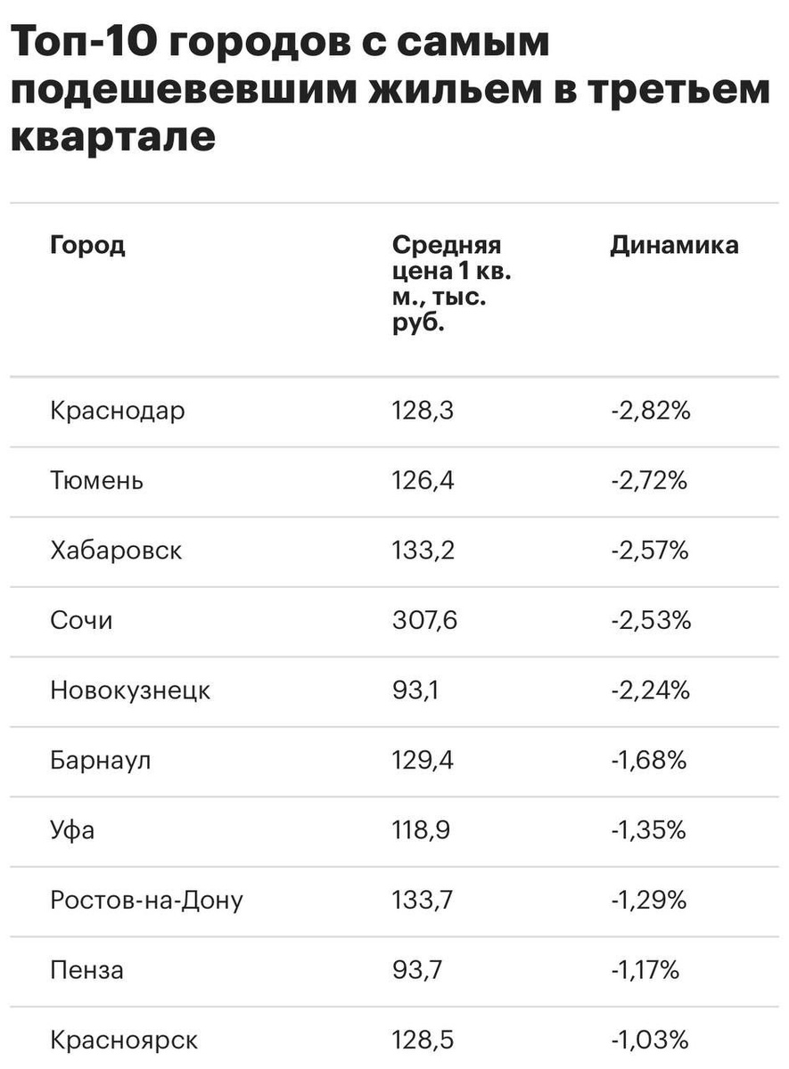 ❕Цены на вторичку снизились более чем в трети крупных городов России По итогам III квартала 2025 года падение цен на вторичное жилье зафиксировано в 18 из 50 крупнейших городов. Во II квартале снижение наблюдалось всего в трех городах, а в I квартале — лишь в одном. Эксперты связывают коррекцию с охлаждением спроса после активного первого полугодия и высокими ипотечными ставками. 📉Лидеры падения цен в III квартале: 🥾Краснодар — -2,82% (128,3 тыс. руб./м²) 🥾Тюмень — -2,72% (126,4 тыс. руб./м²) 🥾Хабаровск — -2,57% (133,2 тыс. руб./м²) 🥾Сочи — -2,53% (307,6 тыс. руб./м²) 🥾Новокузнецк — -2,24% (93,1 тыс. руб./м²)