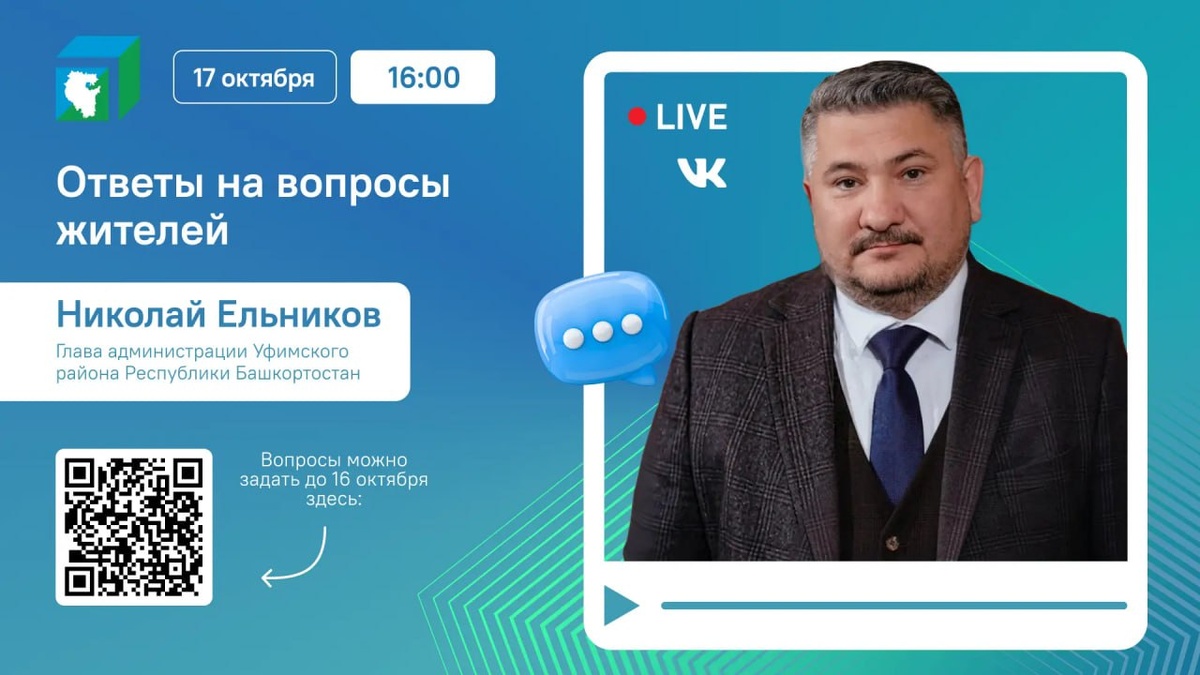 Глава администрации Уфимского района Николай Ельников ответит на вопросы жителей. Прямой эфир пройдет в Центре управления республикой 17 октября в 16:00. Это отличная возможность напрямую получить информацию о планах благоустройства, ремонте дорог, развитии инфраструктуры и по другим темам. Свой вопрос Николаю Ельникову можно оставить на Платформе обратной связи «Госуслуги. Решаем вместе» https://pos.gosuslugi.ru/lkp/direct-line/10235/ до 16 октября. 💚 ЦУР Башкортостана